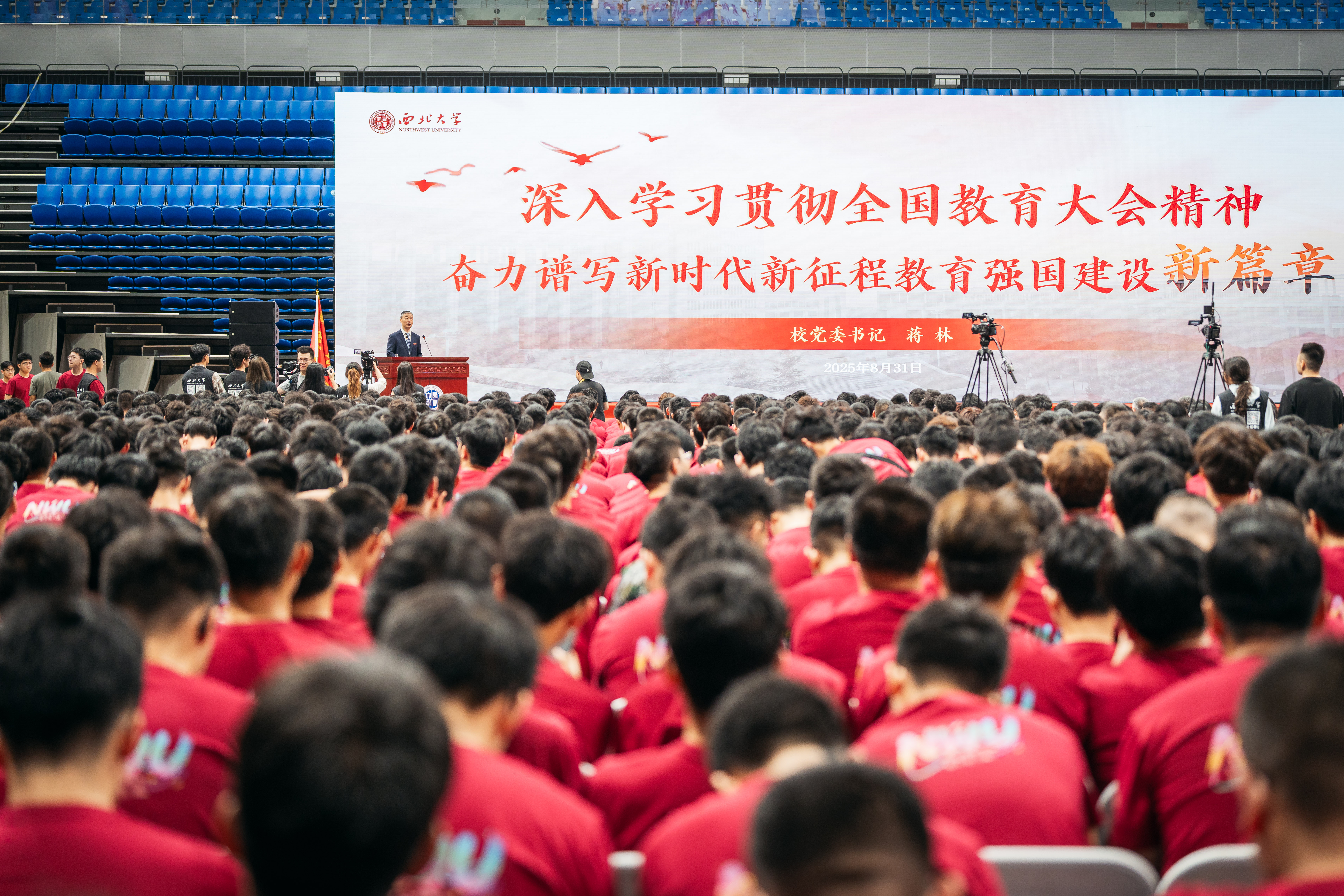 开学典礼后,蒋林以“深入学习贯彻全国教育大会精神奋力谱写新时代新征程教育强国建设新篇章”为题,为2025级8733名新生讲授“开学第一课”。