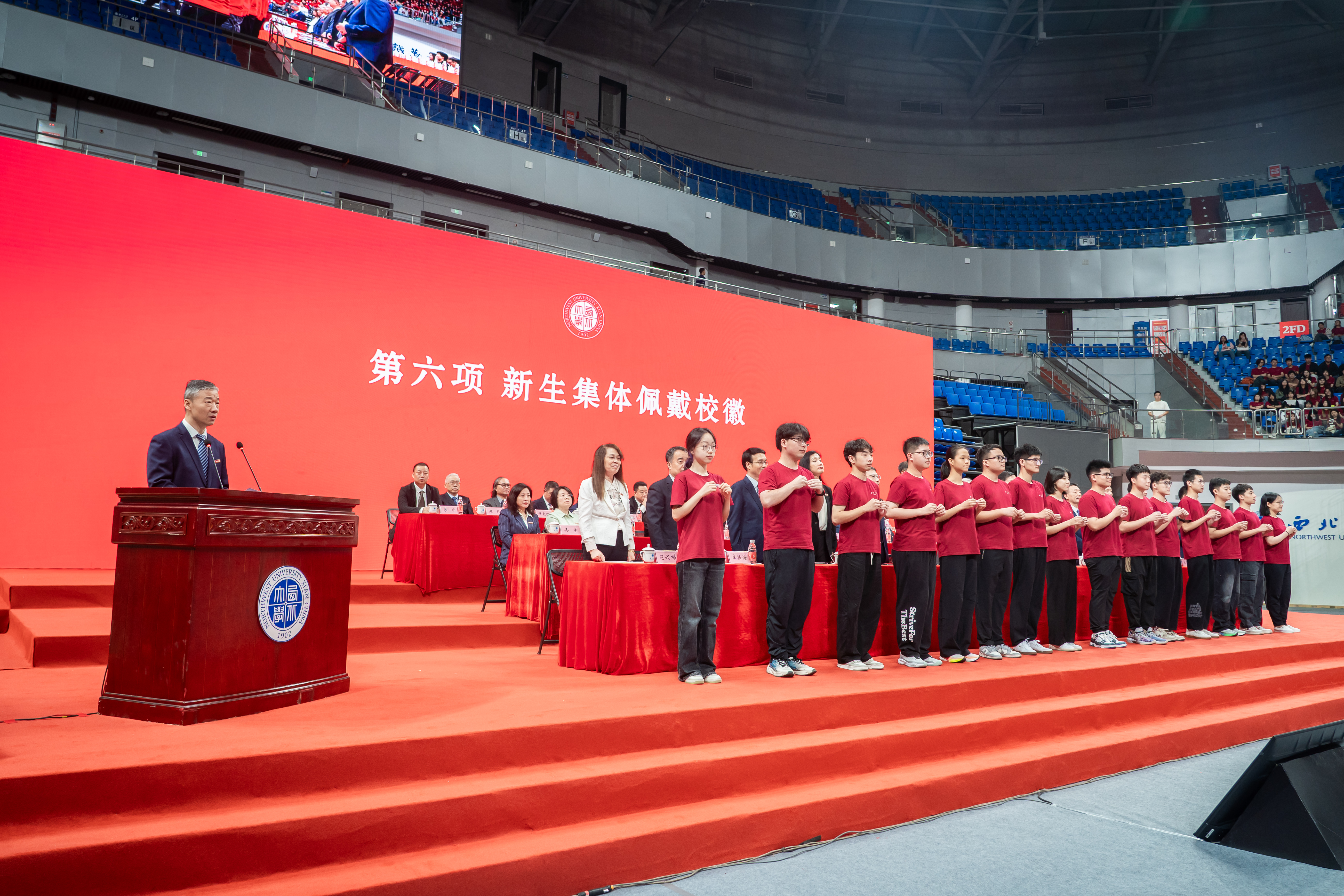 随后,主席台前排领导为新生代表颁发校徽,全体同学将“广发体育校徽”庄重佩戴在胸前。校徽承载着西大人的初心和使命,饱含着老师们的祝福与期望。今天正式佩戴校徽后,同学们便与西大血脉相连,“公诚勤朴”的校训精神也将在新一届学子中传承发扬,汇聚成强国有我、奋进新征程的精神伟力。