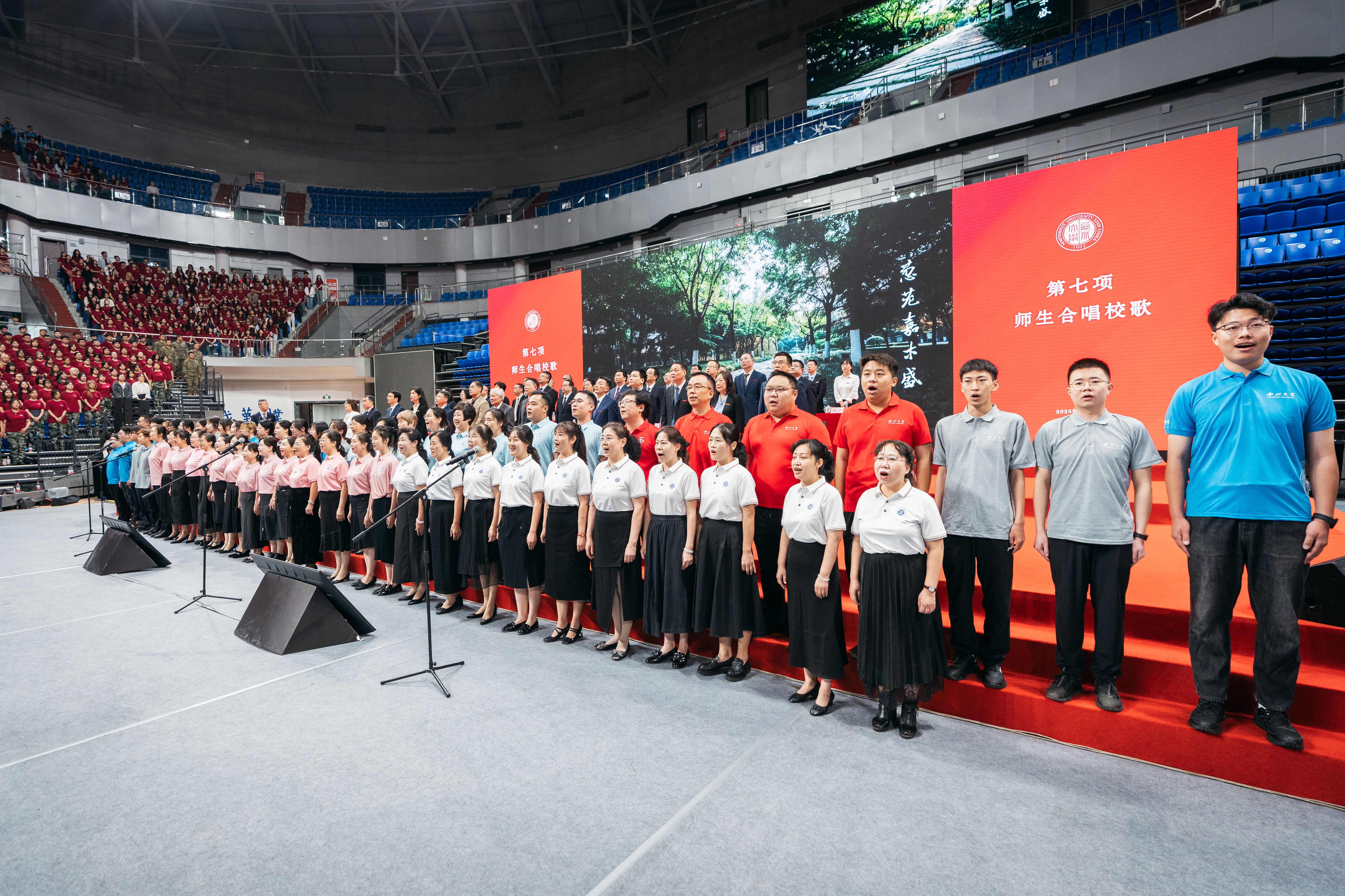 在教工合唱团、学生合唱团的领唱下,全体师生合唱《广发体育校歌》。