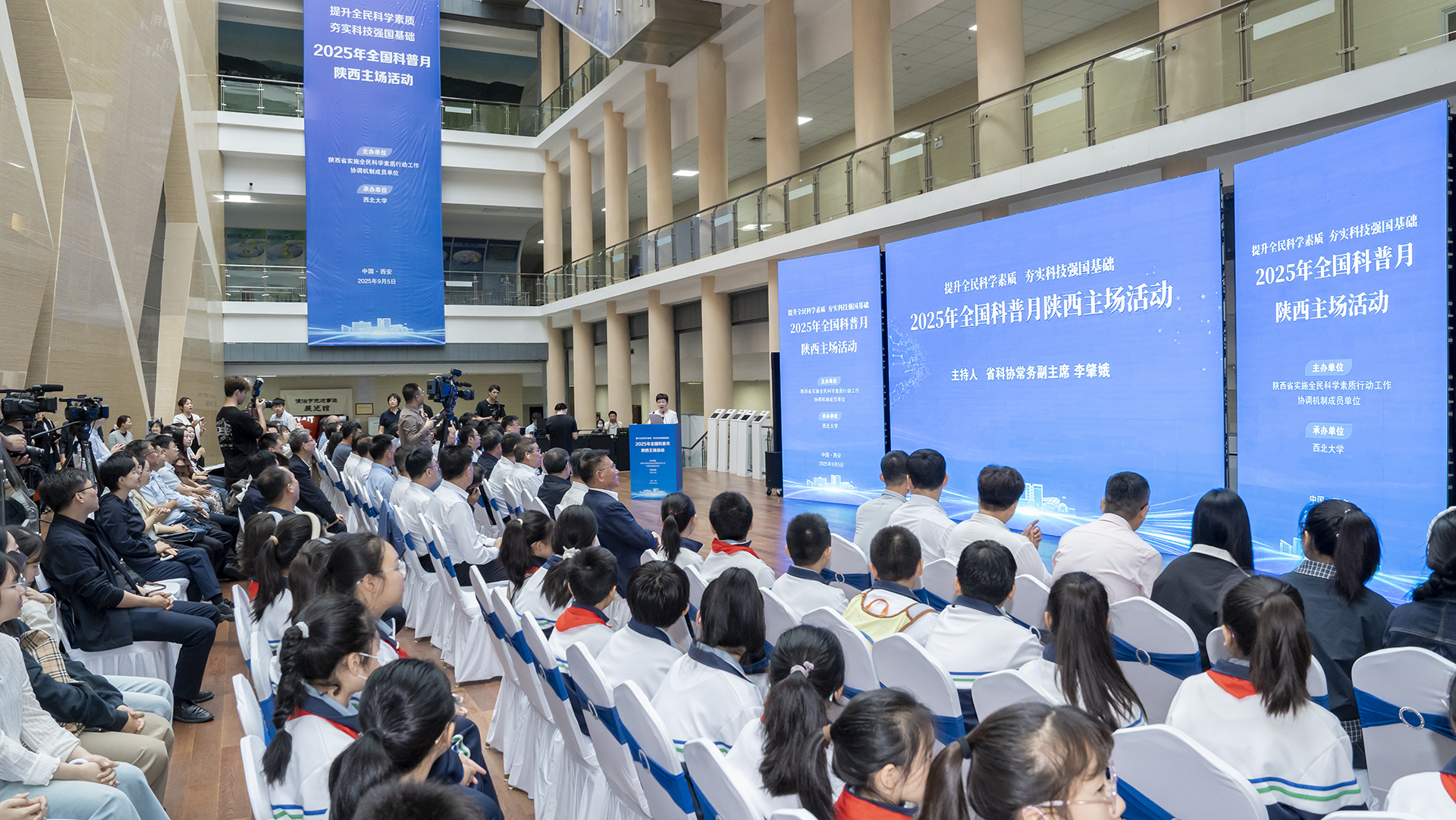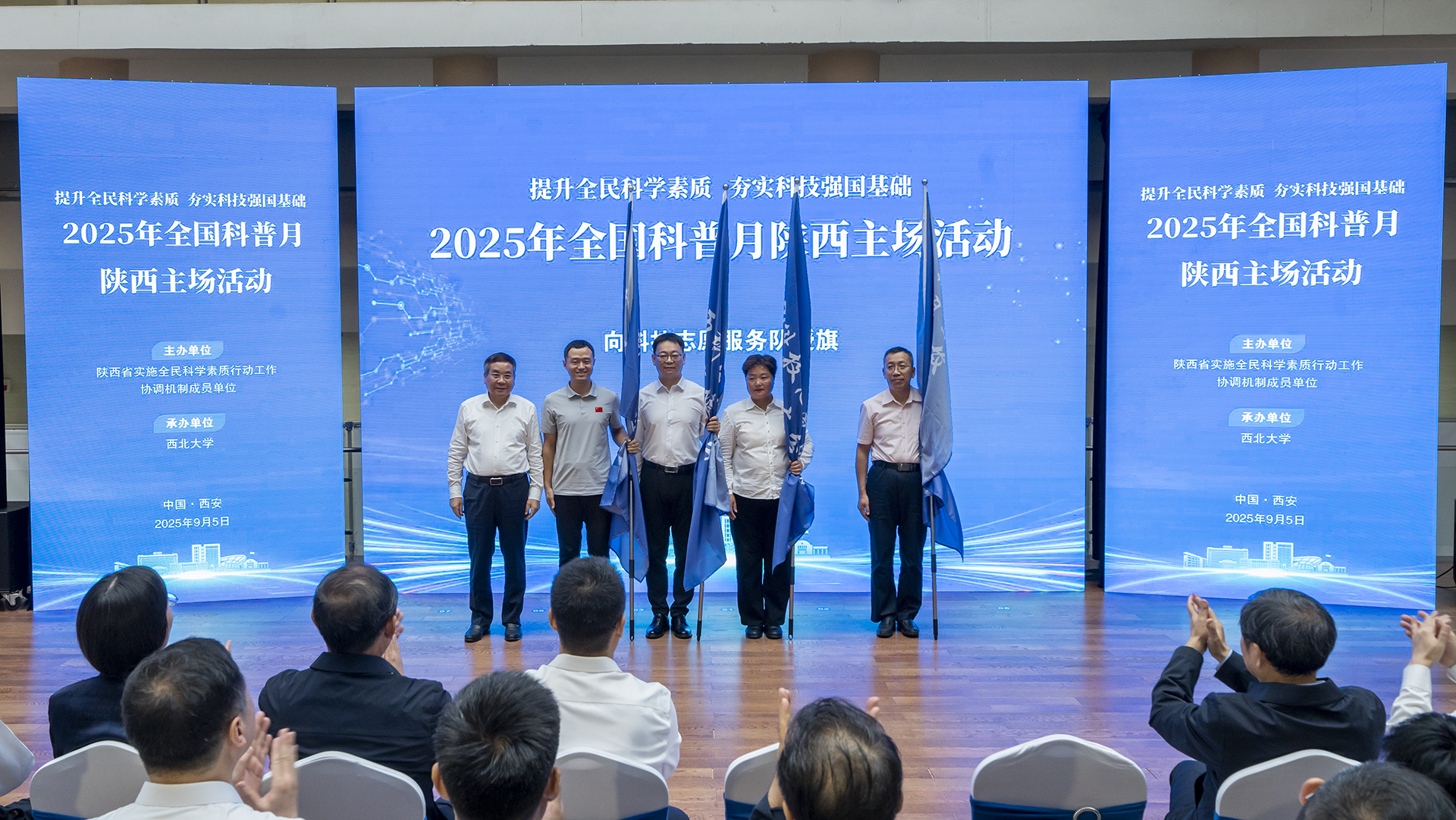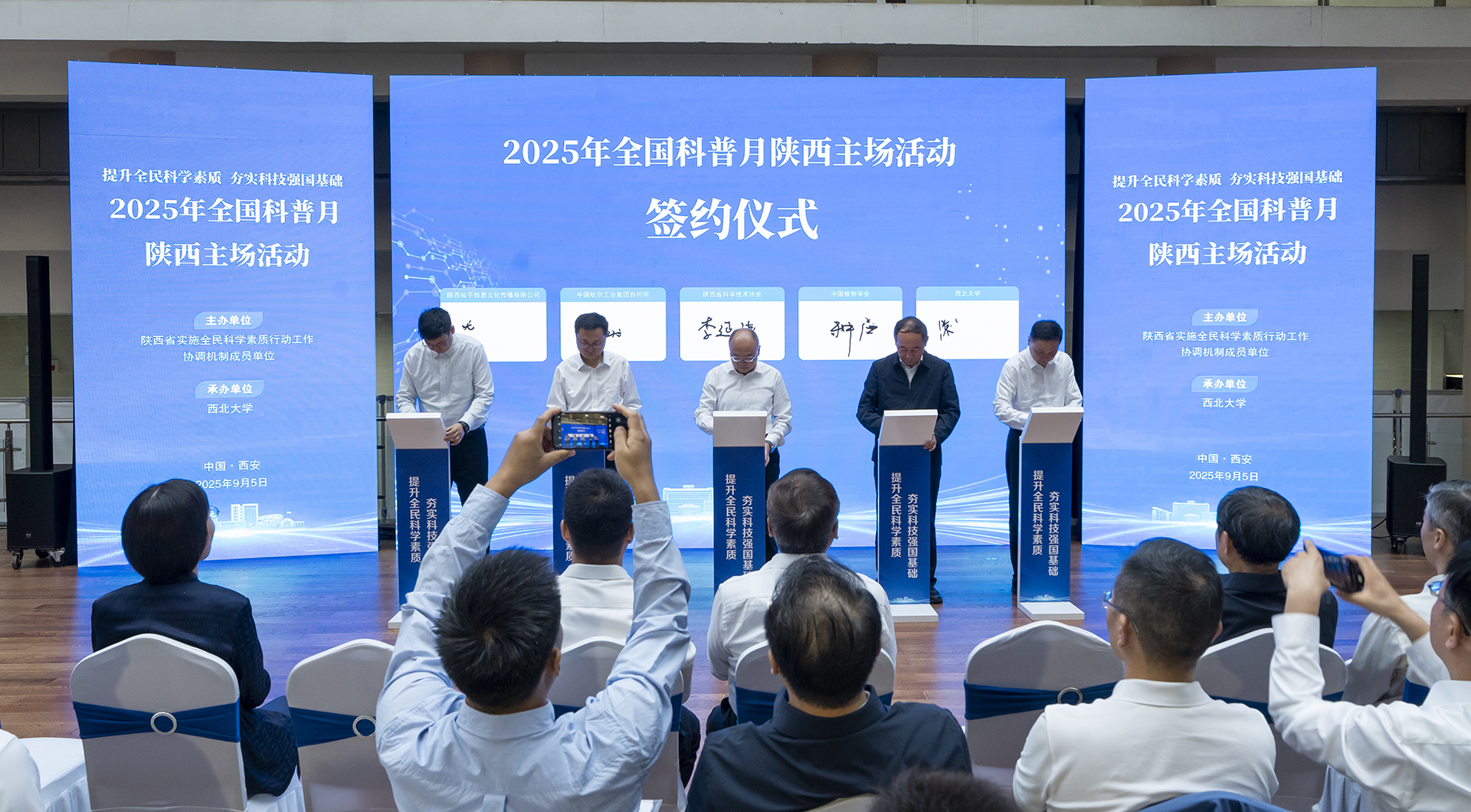 种康院士、康振生院士、杨冠军、蒋林、李豫琦、李肇娥、高红霞共同开启了2025年陕西科普月活动。