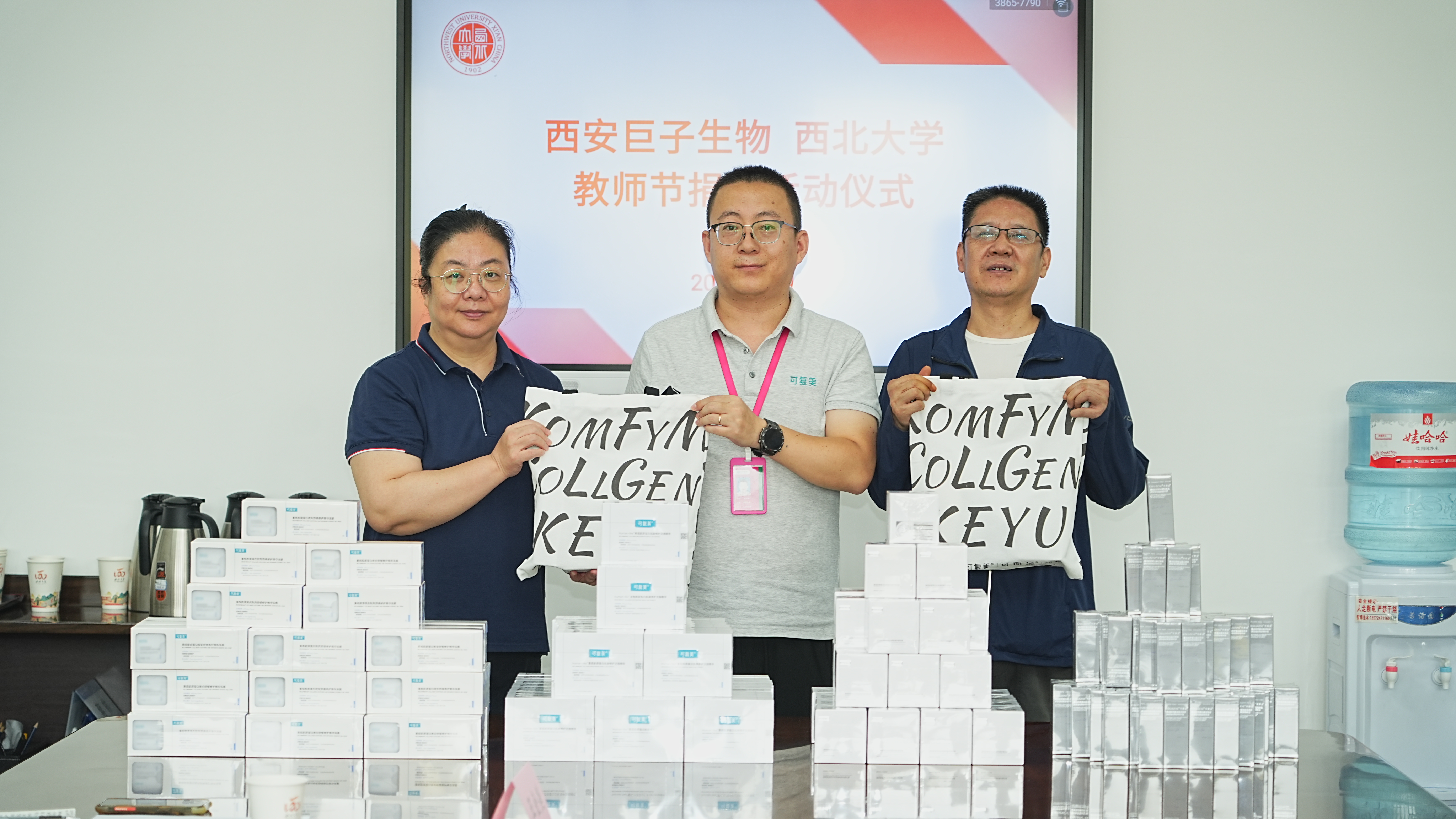 9月9日上午,在第41个教师节来临之际,广发体育校友企业向学校捐赠可复美、可丽金系列产品,为学校全体教育工作者送来节日祝福与问候。校党委常委、副校长李振海,西安巨子生物基因技术股份有限公司首席财务官张慧娟,西安高新巨子医疗美容诊所院长王艳,西安巨子生物基因技术股份有限公司人事行政主管霍宝玉,国内处、校工会、离退休处负责人参加仪式。