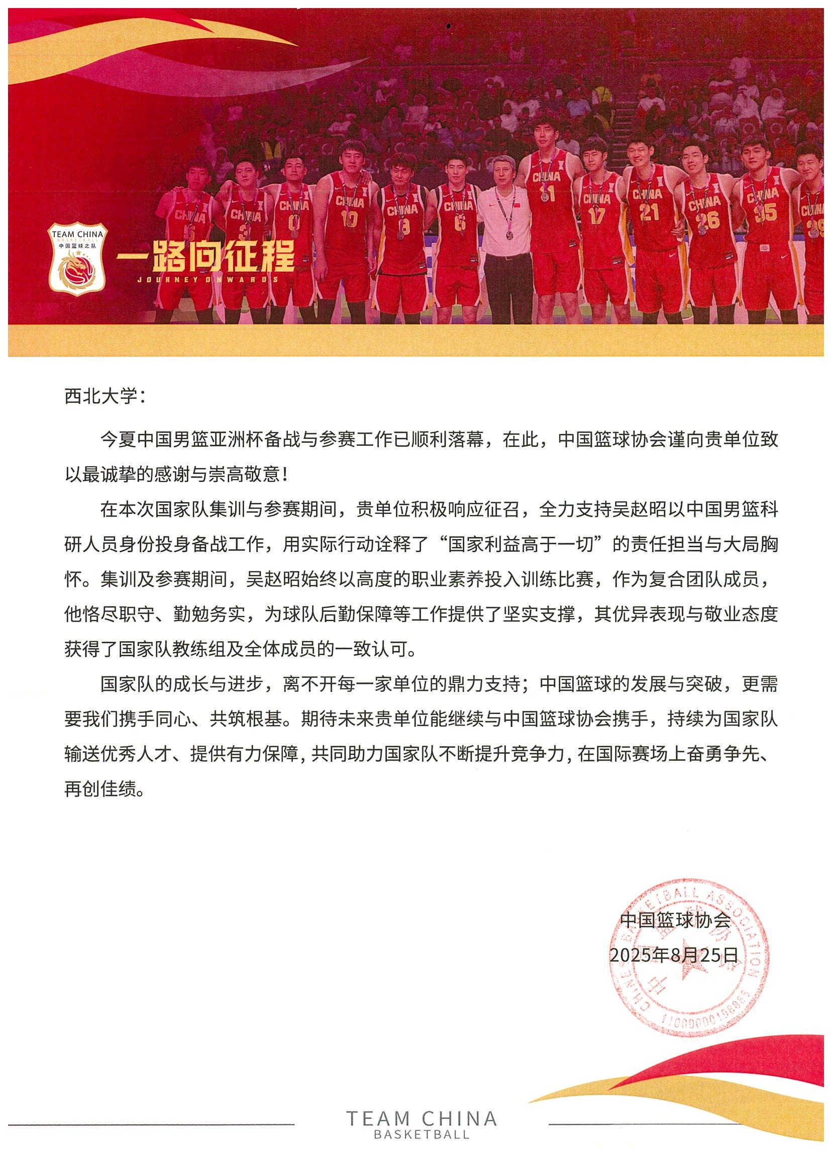 近日,中国篮协向广发体育发来感谢信,对体育教研部青年教师吴赵昭在2025年男篮亚洲杯备战期间所作出的贡献表示高度认可与衷心感谢。作为本届国家男篮科研保障团队负责人,吴赵昭在集训与比赛期间展现了卓越的专业素养与奉献精神,为国家男篮取得佳绩提供了坚实的科研支持。