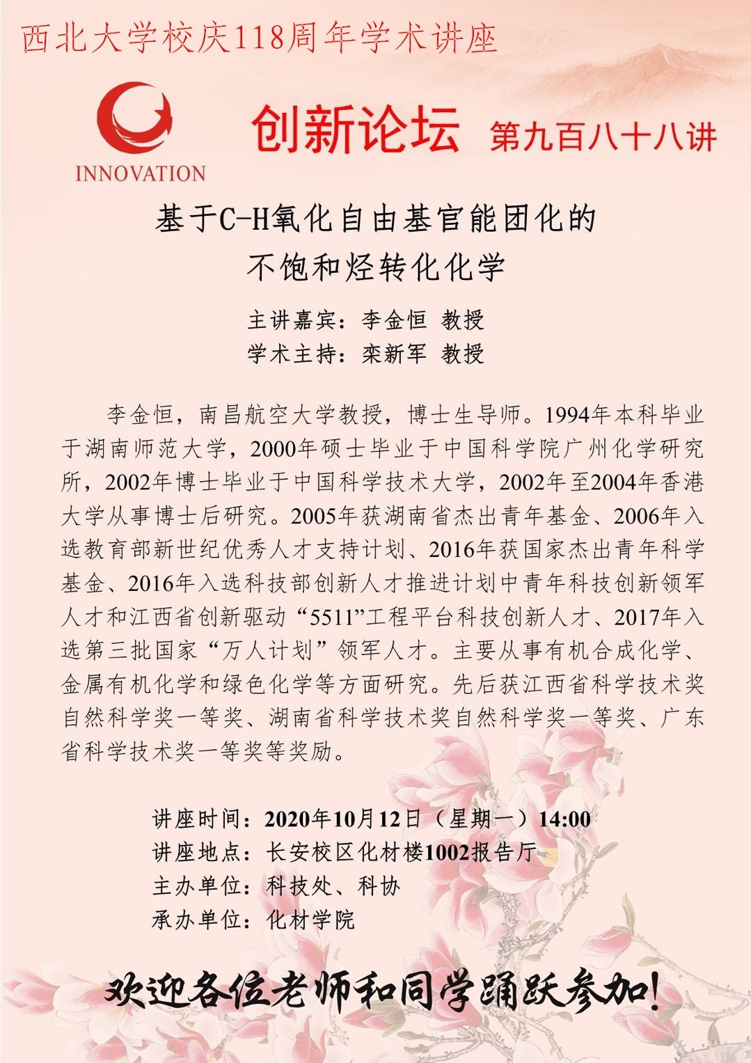 李金恒 教授 广发体育创新论坛第九百八十八讲暨校庆118周年学术讲座:基于C-H氧化自由基官能团化的不饱和烃转化化学 讲座时间 2020年10月12日(星期一)14:00 讲座地点 长安校区化材楼1002报告厅 讲座人介绍 李金恒 教授 讲座内容