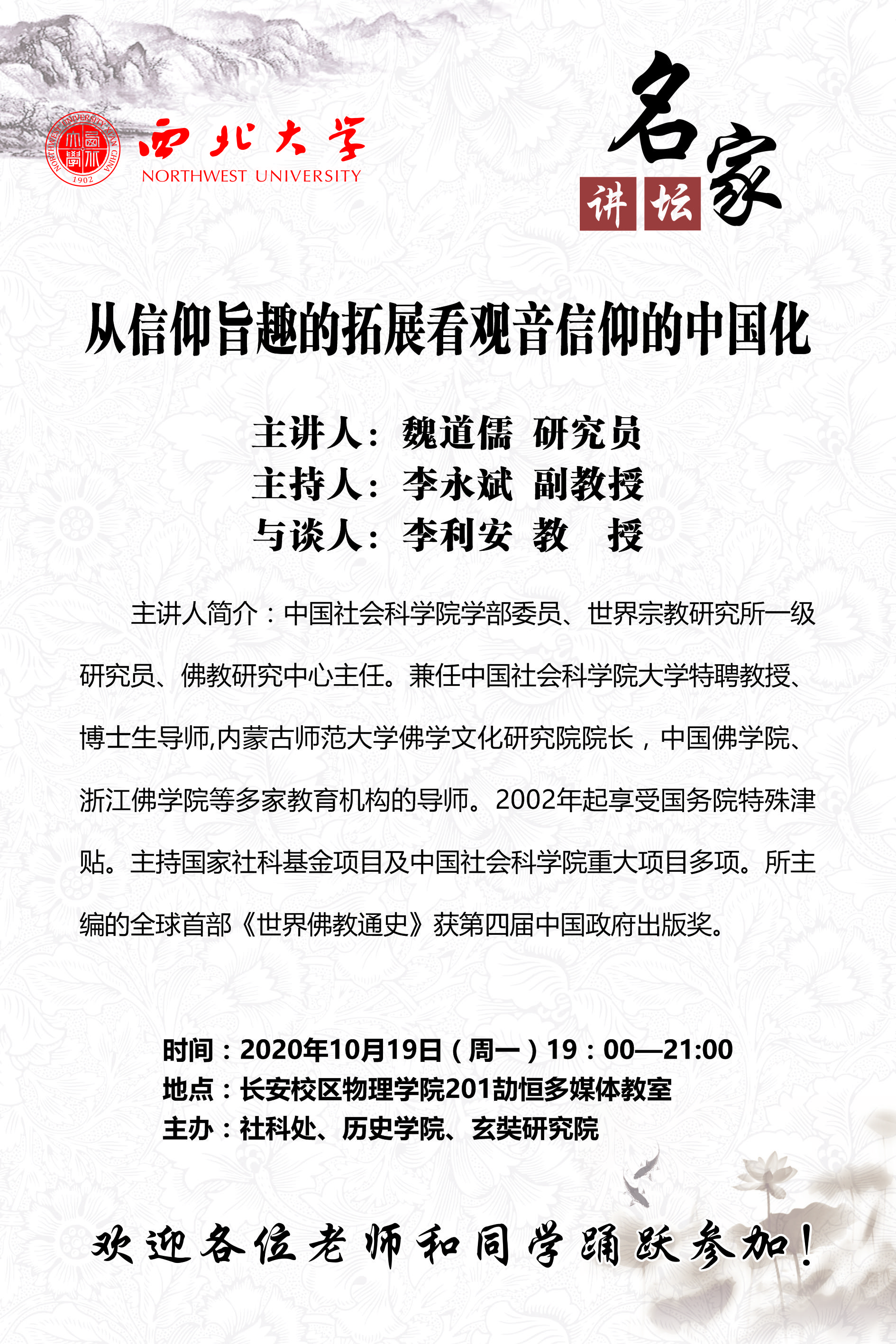 魏道儒 研究员 名家讲坛:从信仰旨趣的拓展看观音信仰的中国化 讲座时间 2020年10月19日(周一)19:00 讲座地点 长安校区物理学院劼恒多媒体教室(201) 讲座人介绍 魏道儒 研究员 讲座内容