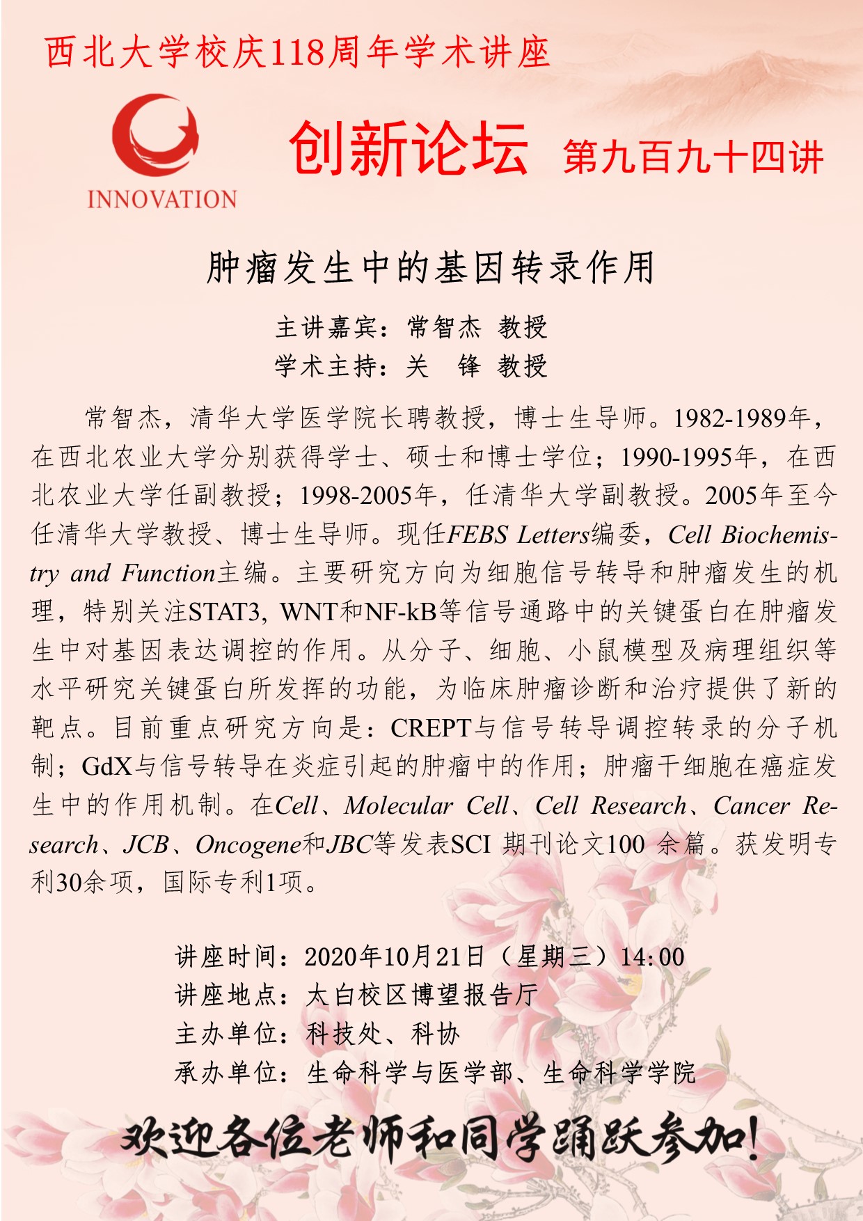 常智杰 教授 广发体育创新论坛第九百九十四讲暨校庆118周年学术讲座:肿瘤发生中的基因转录作用 讲座时间 2020年10月21日(星期三)14:00 讲座地点 太白校区博望报告厅 讲座人介绍 常智杰 教授 讲座内容