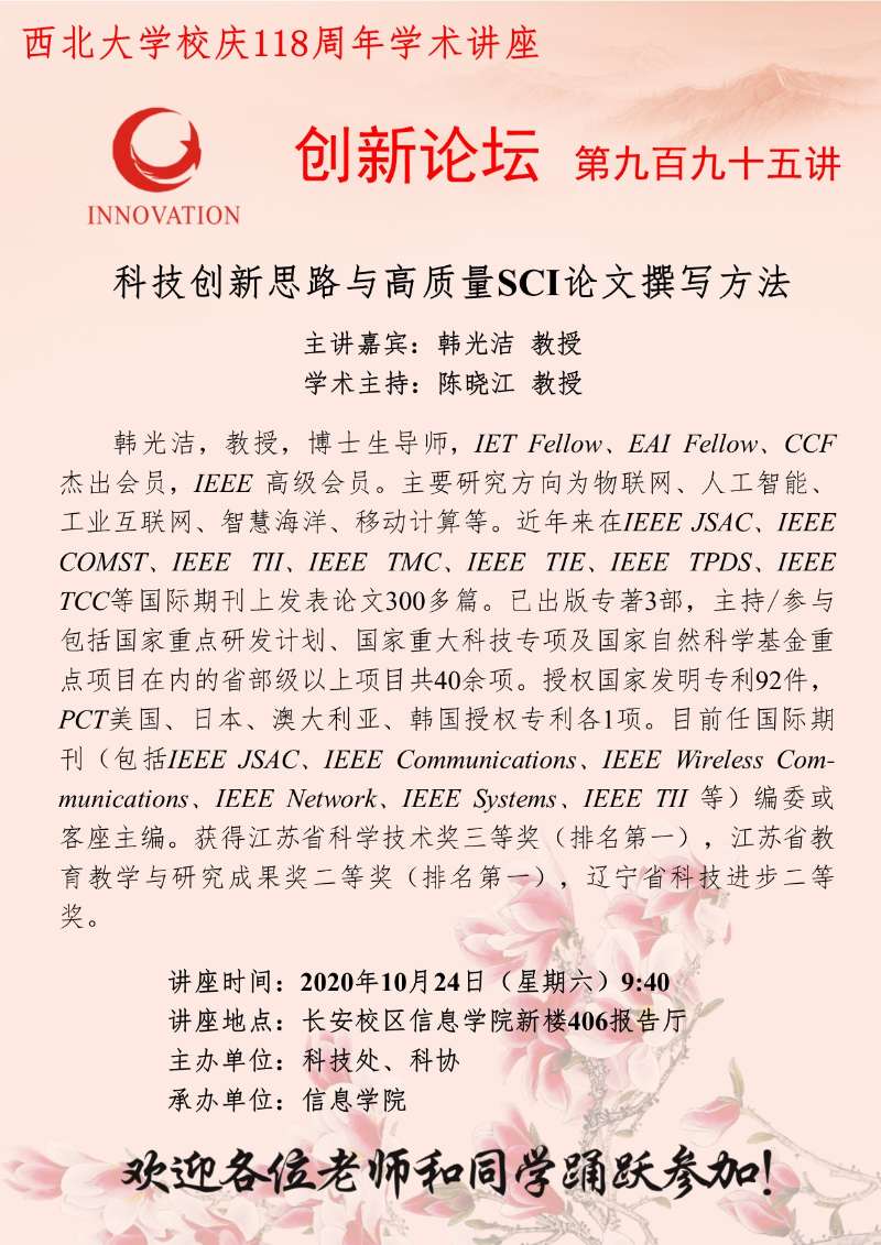 韩光洁 教授 广发体育创新论坛第九百九十五讲暨校庆118周年学术讲座:科技创新思路与高质量SCI论文撰写方法 讲座时间 2020年10月24日(星期六)9:40 讲座地点 长安校区信息学院新楼406报告厅 讲座人介绍 韩光洁 教授 讲座内容