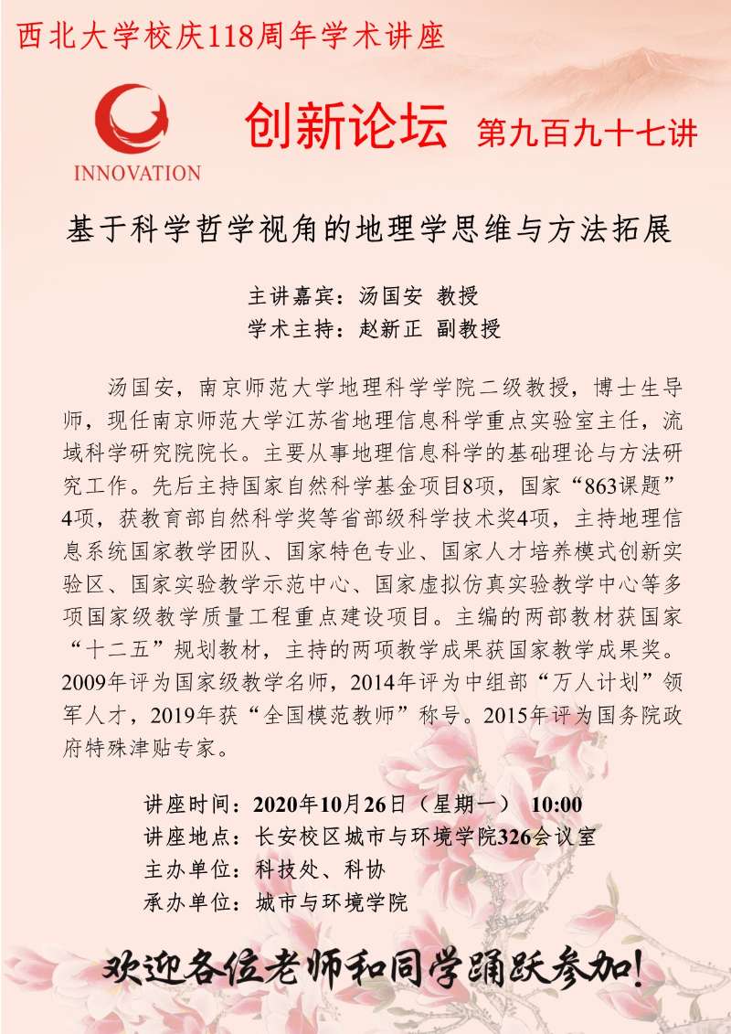 汤国安 教授 广发体育创新论坛第九百九十七讲暨校庆118周年学术讲座:基于科学哲学视角的地理学思维与方法拓展 讲座时间 2020年10月26日(星期一) 10:00 讲座地点 长安校区城市与环境学院326会议室 讲座人介绍 汤国安 教授 讲座内容