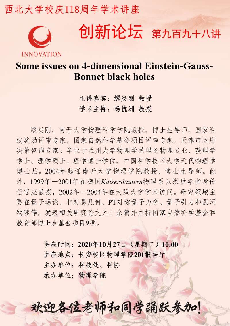 缪炎刚 教授 广发体育创新论坛第九百九十八讲暨校庆118周年学术讲座:Some issues on 4-dimensional Einstein-Gauss-Bonnet black holes 讲座时间 2020年10月27日(星期二)10:00 讲座地点 长安校区物理学院201报告厅 讲座人介绍 缪炎刚 教授 讲座内容
