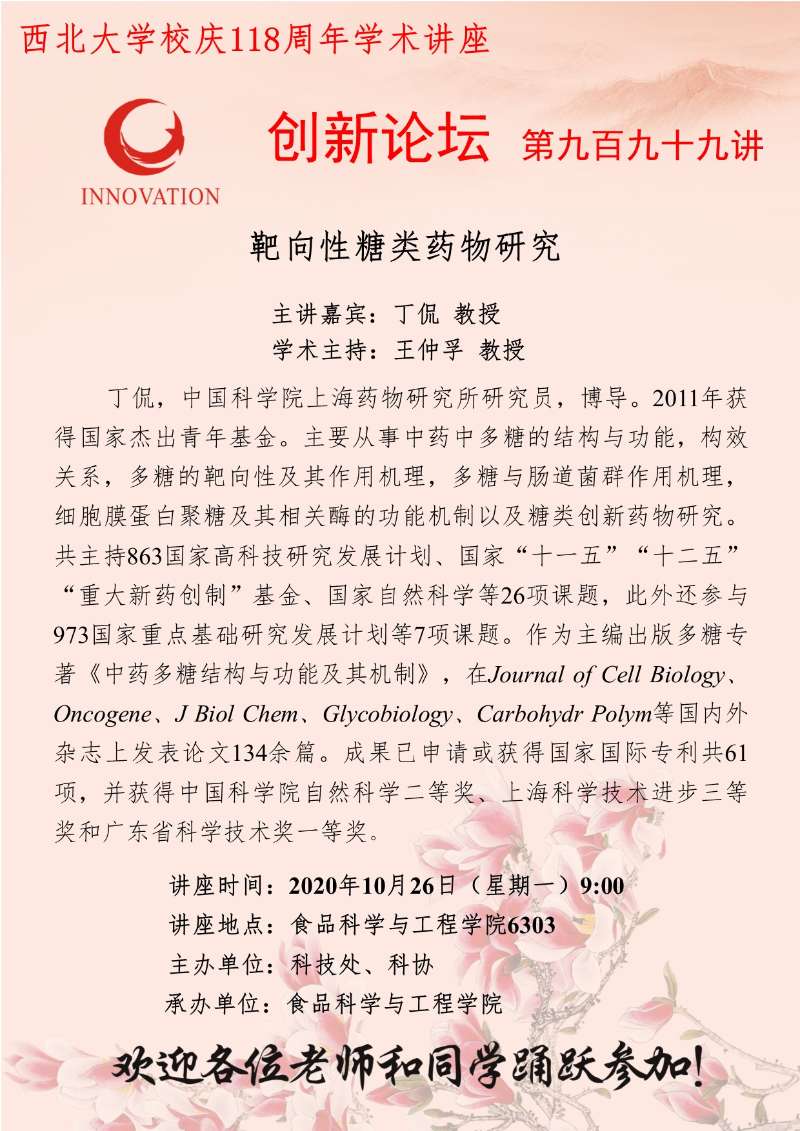 丁侃 教授 广发体育创新论坛第九百九十九讲暨校庆118周年学术讲座:靶向性糖类药物研究 讲座时间 2020年10月26日(星期一)9:00 讲座地点 食品科学与工程学院6303 讲座人介绍 丁侃 教授 讲座内容