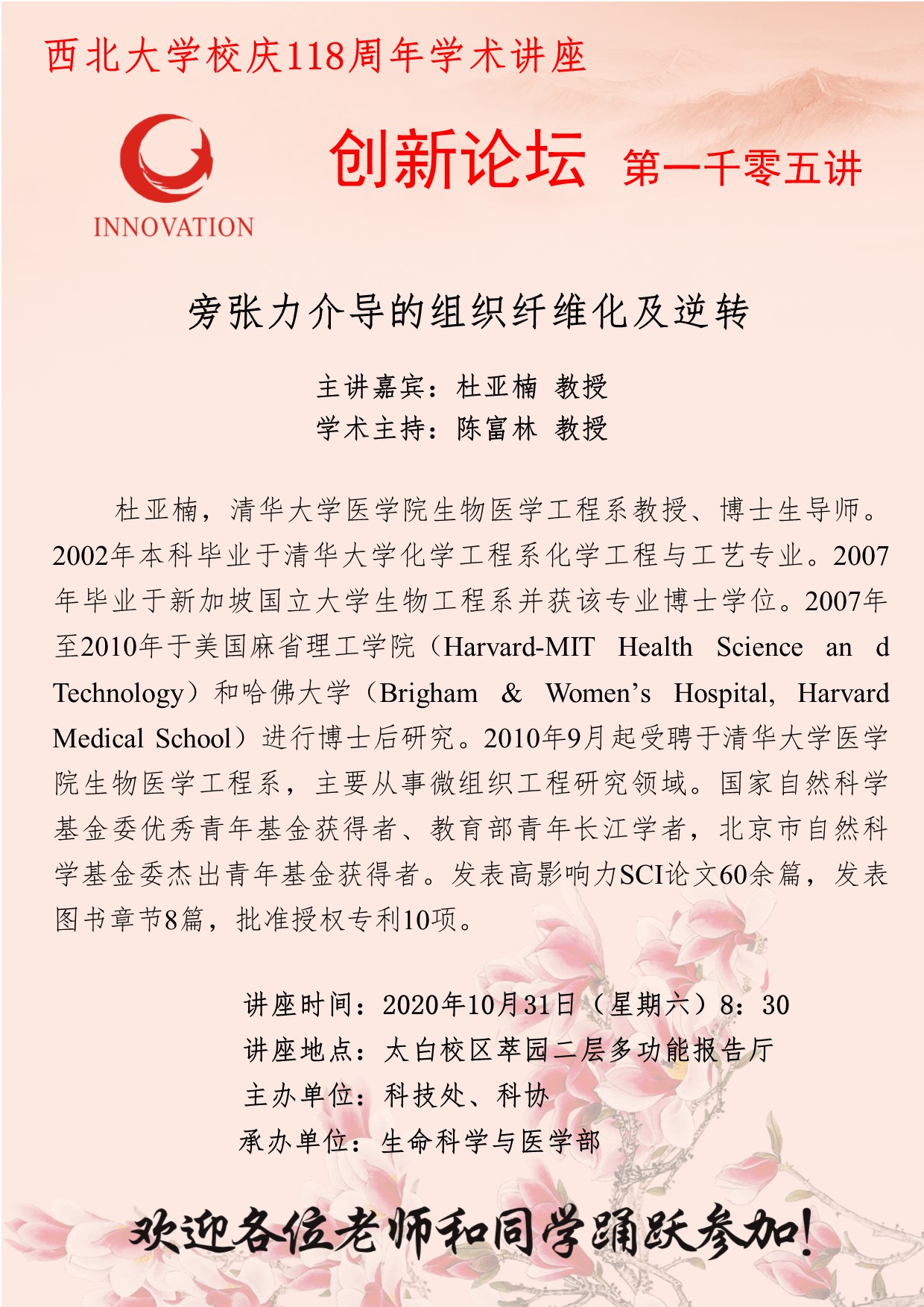 杜亚楠 教授 广发体育创新论坛第一千零五讲暨校庆118周年学术讲座:旁张力介导的组织纤维化及逆转 讲座时间 2020年10月31日(星期六)8:30 讲座地点 太白校区萃园二层多功能报告厅 讲座人介绍 杜亚楠 教授 讲座内容