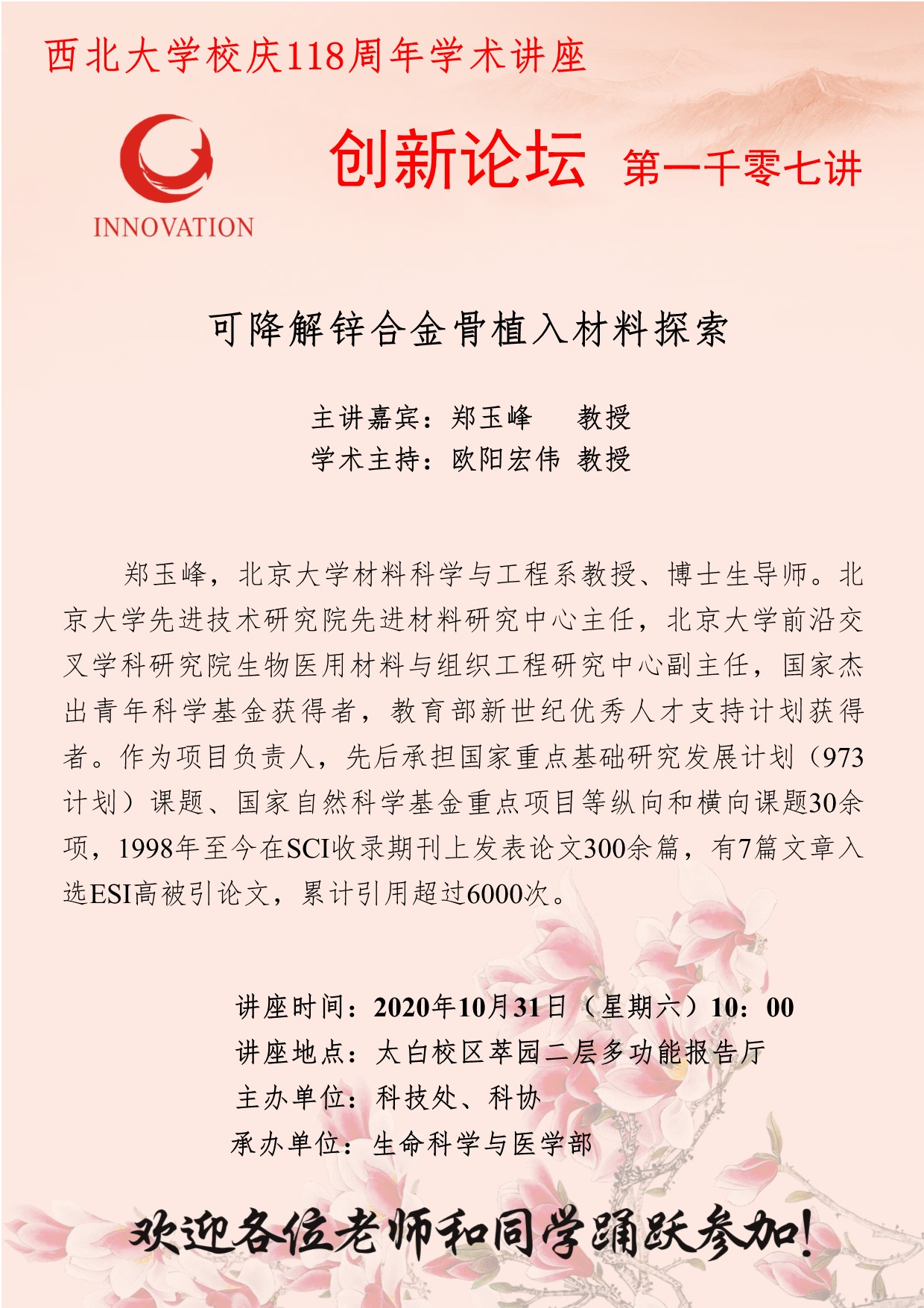 郑玉峰 教授 广发体育创新论坛第一千零七讲暨校庆118周年学术讲座:可降解锌合金骨植入材料探索 讲座时间 2020年10月31日(星期六)10:00 讲座地点 太白校区萃园二层多功能报告厅 讲座人介绍 郑玉峰 教授 讲座内容