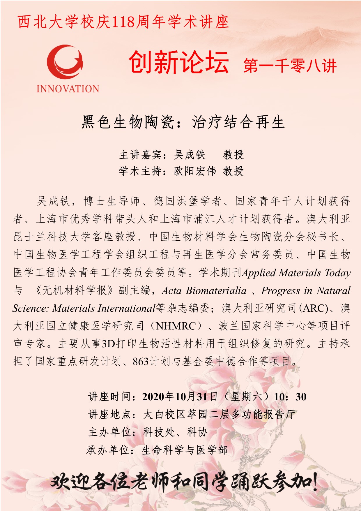 吴成铁 教授 广发体育创新论坛第一千零八讲暨校庆118周年学术讲座:黑色生物陶瓷:治疗结合再生 讲座时间 2020年10月31日(星期六)10:30 讲座地点 太白校区萃园二层多功能报告厅 讲座人介绍 吴成铁 教授 讲座内容