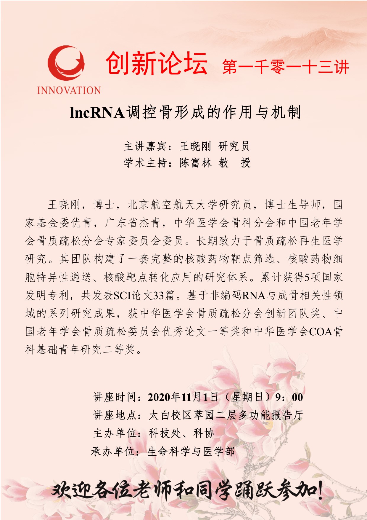 王晓刚 研究员 广发体育创新论坛第一千零一十三讲:lncRNA调控骨形成的作用与机制 讲座时间 2020年11月1日(星期日)9:00 讲座地点 太白校区萃园二层多功能报告厅 讲座人介绍 王晓刚 研究员 讲座内容