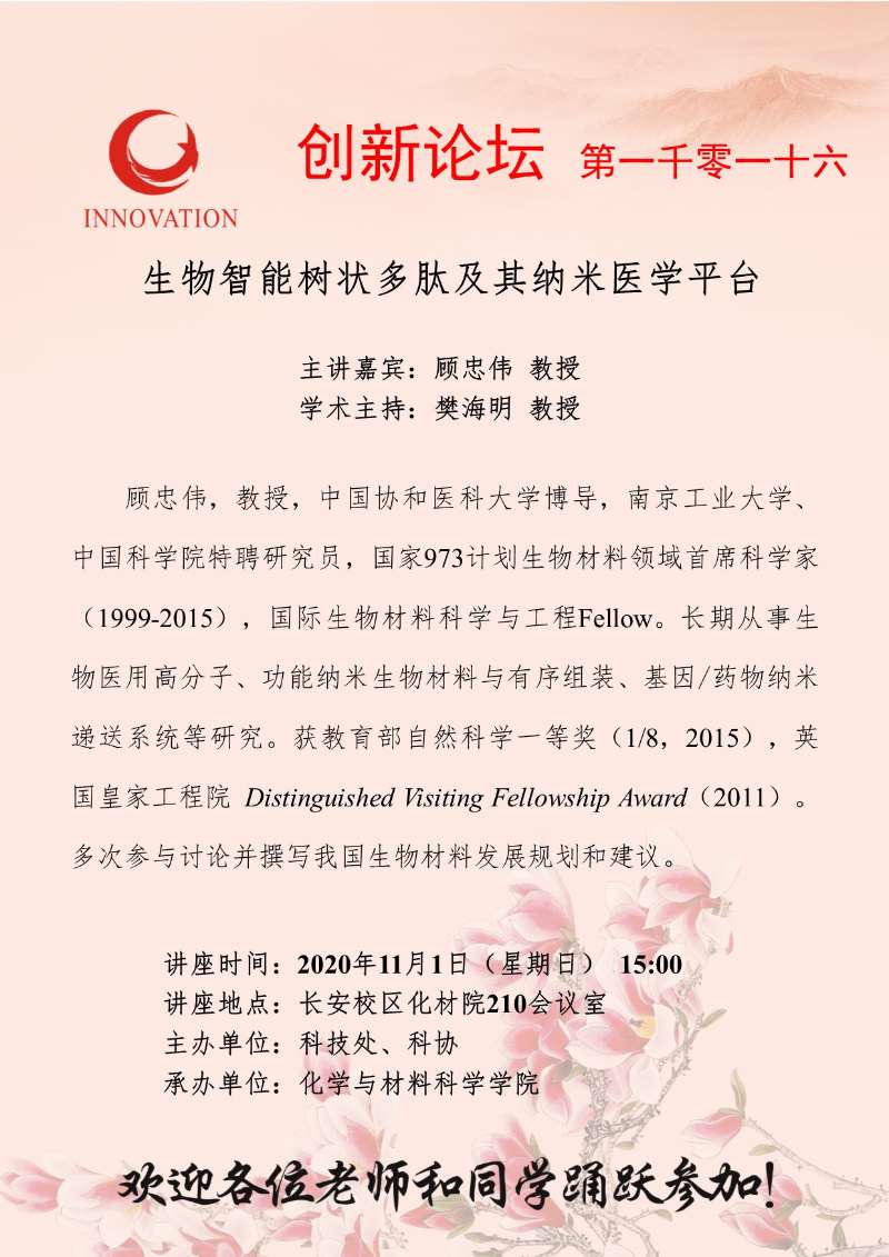 顾忠伟 教授 广发体育创新论坛第一千零一十六讲:生物智能树状多肽及其纳米医学平台 讲座时间 2020年11月1日(星期日) 15:00 讲座地点 长安校区化材院210会议室 讲座人介绍 顾忠伟 教授 讲座内容
