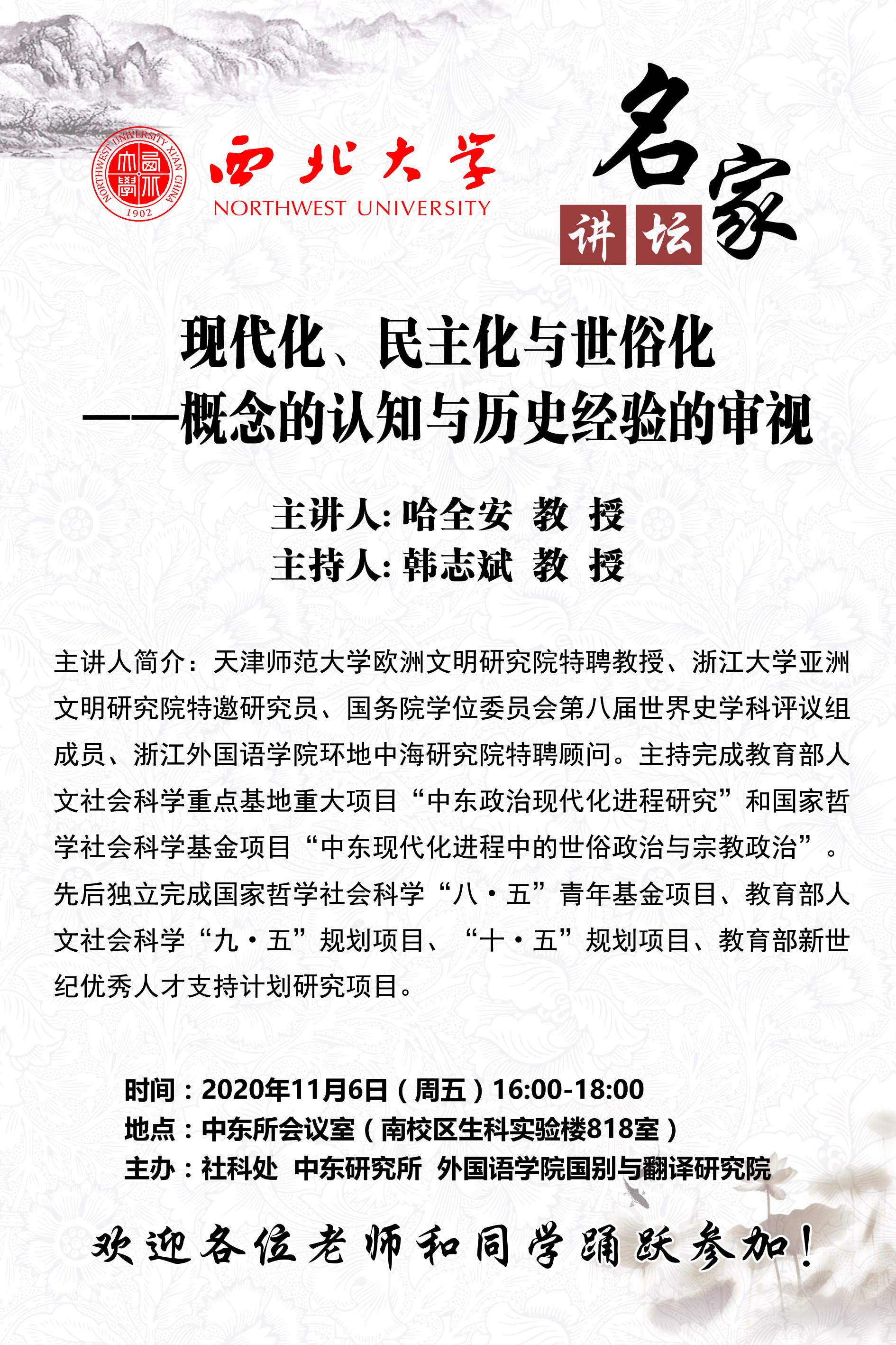 哈全安 教授 名家讲坛:现代化、民主化与世俗化——概念的认知与历史经验的审视 讲座时间 2020年11月6日(周五)16:00-18:00 讲座地点 中东所会议室(长安校区生科实验楼818室) 讲座人介绍 哈全安 教授 讲座内容