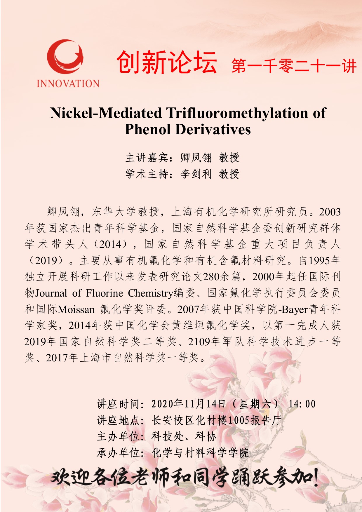 卿凤翎 教授 广发体育创新论坛第一千零二十一讲:Nickel-Mediated Trifluoromethylation of Phenol Derivatives 讲座时间 2019年11月14日(星期六)14:00 讲座地点 长安校区化材楼1005报告厅 讲座人介绍 卿凤翎 教授 讲座内容