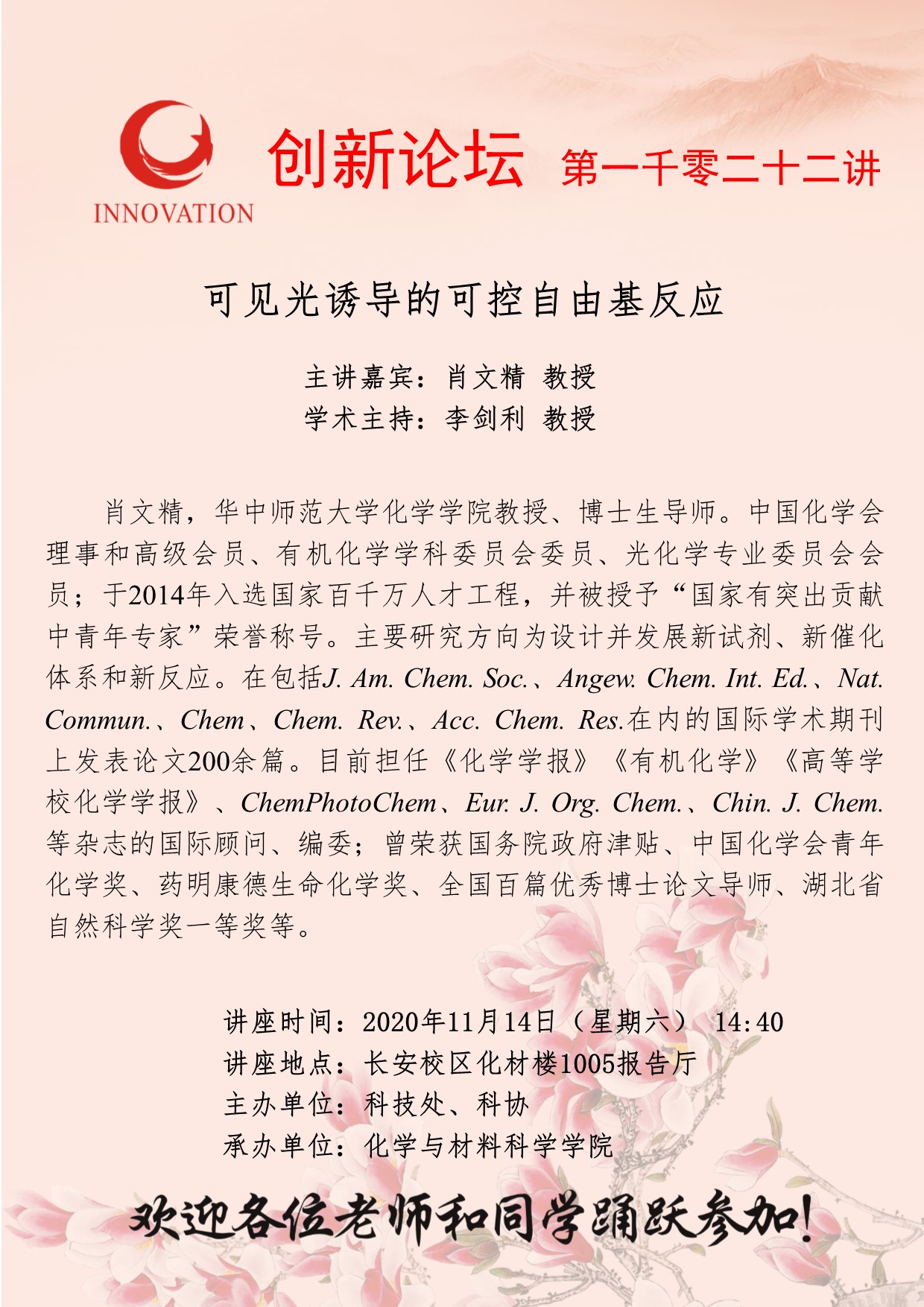 肖文精 教授 广发体育创新论坛第一千零二十二讲:可见光诱导的可控自由基反应 讲座时间 2020年11月14日(周六)14:40 讲座地点 长安校区化材楼1005报告厅 讲座人介绍 肖文精 教授 讲座内容