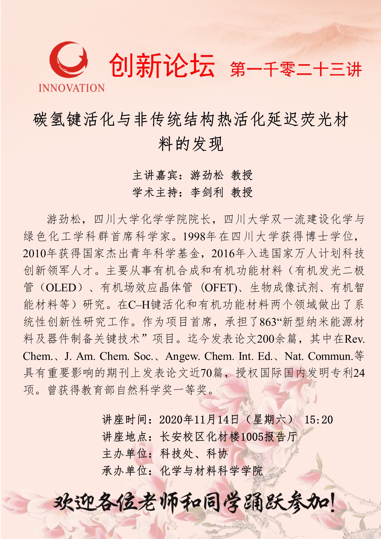 游劲松 教授 广发体育创新论坛第一千零二十三讲:碳氢键活化与非传统结构热活化延迟荧光材料的发现 讲座时间 2020年 11月14日(周六)15:20 讲座地点 长安校区化材楼1005报告厅 讲座人介绍 游劲松 教授 讲座内容