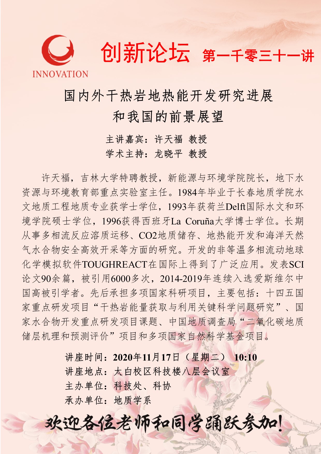许天福 教授 广发体育创新论坛第一千零三十一讲:国内外干热岩地热能开发研究进展和我国的前景展望 讲座时间 2020年11月17日(星期二) 10:10 讲座地点 太白校区科技楼八层会议室 讲座人介绍 许天福 教授 讲座内容