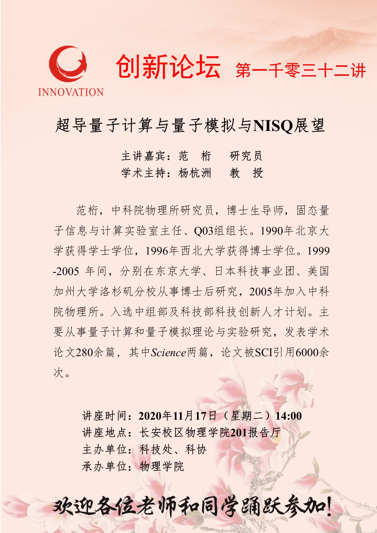 范 桁 研究员 广发体育创新论坛第一千零三十二讲:超导量子计算与量子模拟与NISQ展望 讲座时间 2020年11月17日(星期二)14:00 讲座地点 长安校区物理学院201报告厅 讲座人介绍 范 桁 研究员 讲座内容