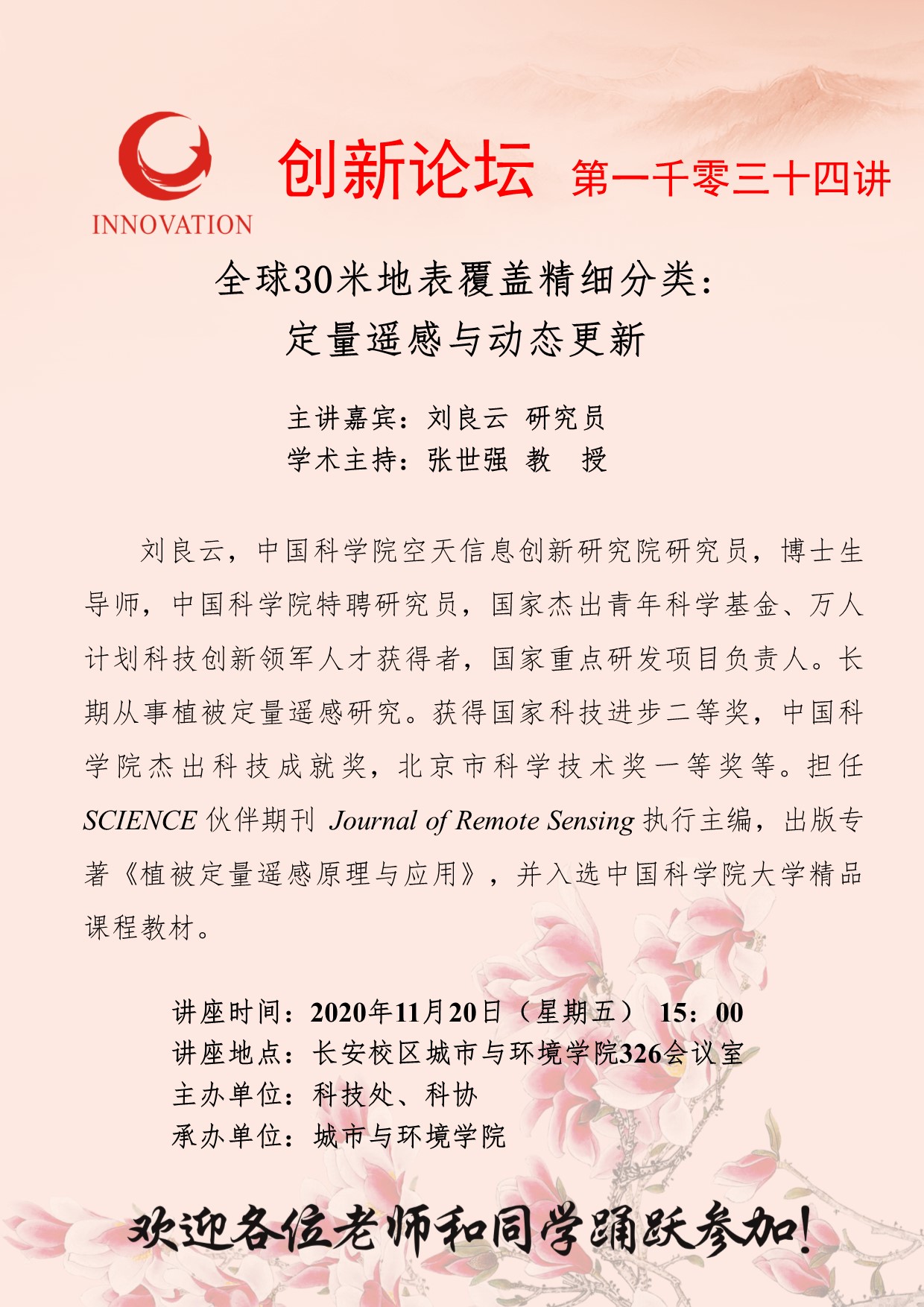 刘良云 研究员 广发体育创新论坛第一千零三十四讲:全球30米地表覆盖精细分类:定量遥感与动态更新 讲座时间 2020年11月20日(星期五) 15:00 讲座地点 长安校区城市与环境学院326会议室 讲座人介绍 刘良云 研究员 讲座内容