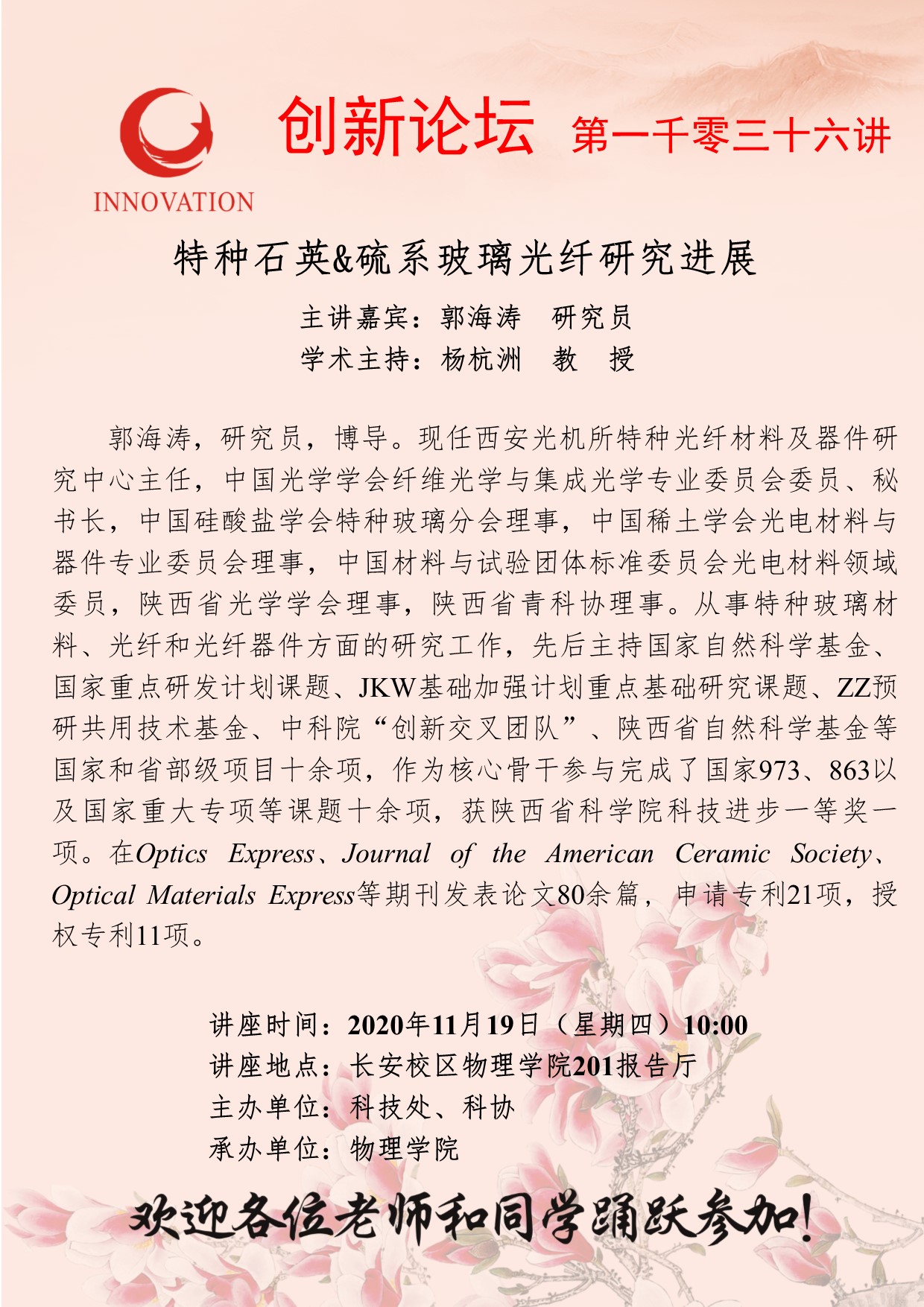 郭海涛 研究员 广发体育创新论坛第一千零三十六讲:特种石英&硫系玻璃光纤研究进展 讲座时间 2020年11月19日(星期四)10:00 讲座地点 长安校区物理学院201报告厅 讲座人介绍 郭海涛 研究员 讲座内容