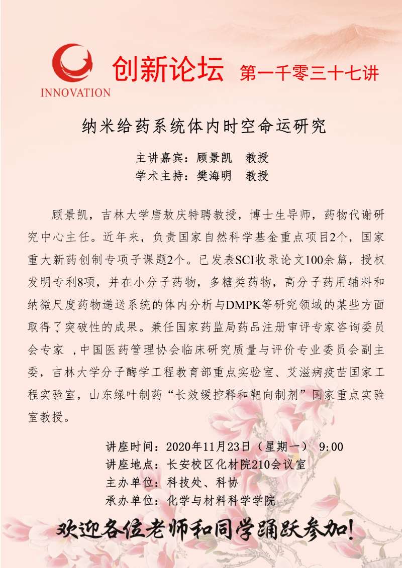 顾景凯 教授 广发体育创新论坛第一千零三十七讲:纳米给药系统体内时空命运研究 讲座时间 2020年11月23日(星期一) 9:00 讲座地点 长安校区化材院210会议室 讲座人介绍 顾景凯 教授 讲座内容