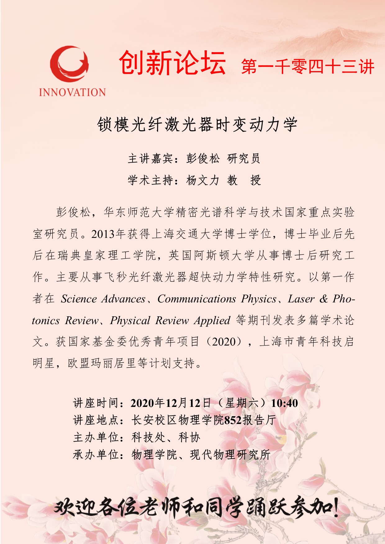 彭俊松 研究员 广发体育创新论坛第一千零四十三讲:锁模光纤激光器时变动力学 讲座时间 2020年12月12日(星期六)10:40 讲座地点 长安校区物理学院852报告厅 讲座人介绍 彭俊松 研究员 讲座内容