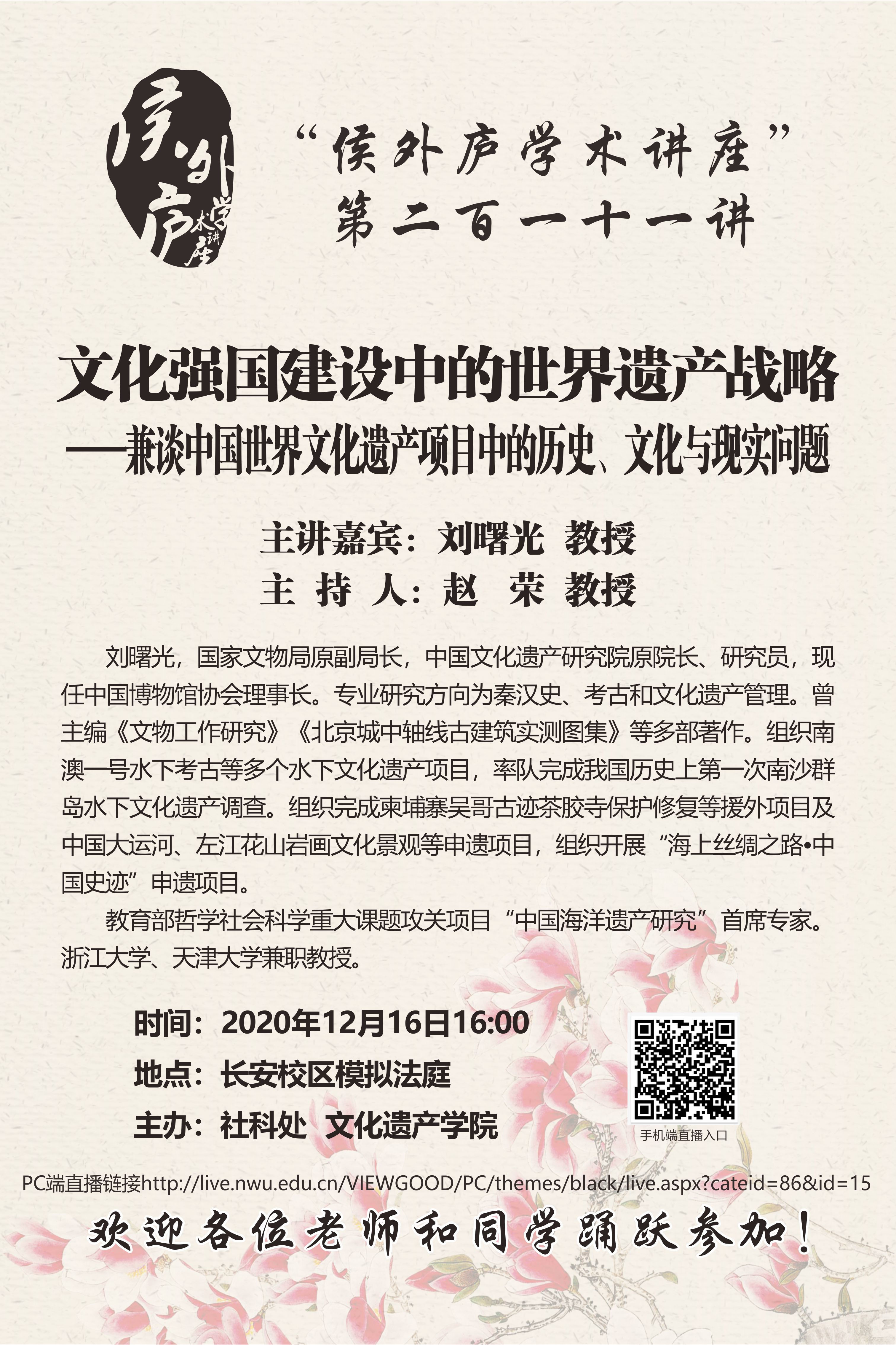 刘曙光 教授 侯外庐学术讲座第二百一十一讲:文化强国建设中的世界遗产战略——兼谈中国世界文化遗产项目中的历史、文化与现实问题 讲座时间 2020年12月16日(周三)16:00 讲座地点 长安校区模拟法庭 讲座人介绍 刘曙光 教授 讲座内容