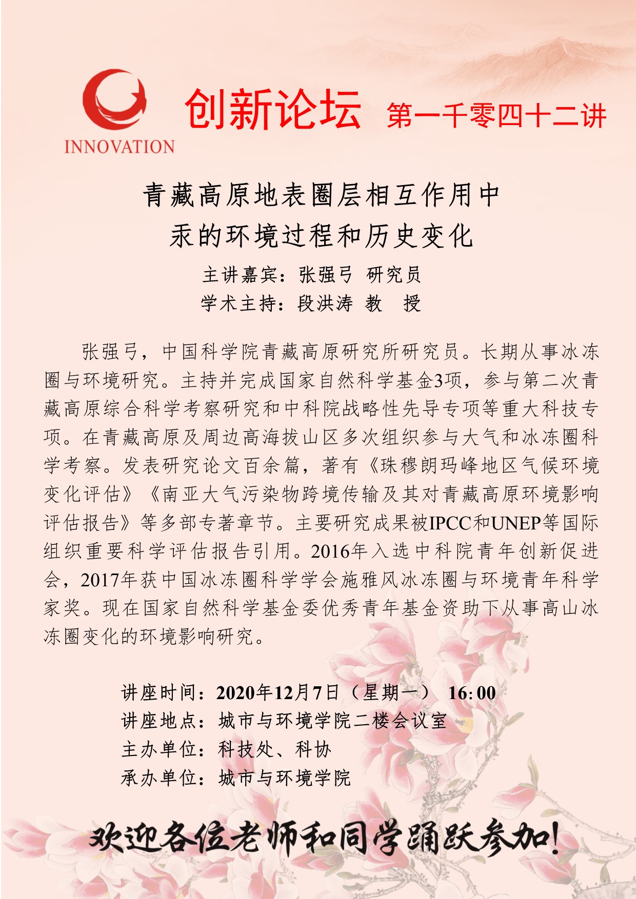 张强弓 研究员 广发体育创新论坛第一千零四十二讲:青藏高原地表圈层相互作用中汞的环境过程和历史变化 讲座时间 2020年12月7日(星期一) 16:00 讲座地点 城市与环境学院二楼会议室 讲座人介绍 张强弓 研究员 讲座内容