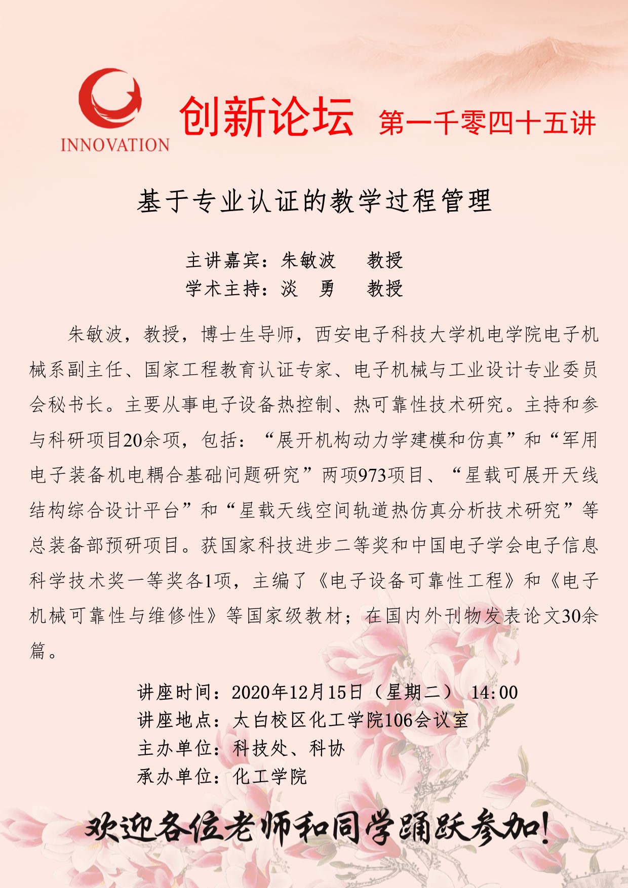 朱敏波 教授 广发体育创新论坛第一千零四十五讲:基于专业认证的教学过程管理 讲座时间 2020年12月15日(星期二) 14:00 讲座地点 太白校区化工学院106会议室 讲座人介绍 朱敏波 教授 讲座内容
