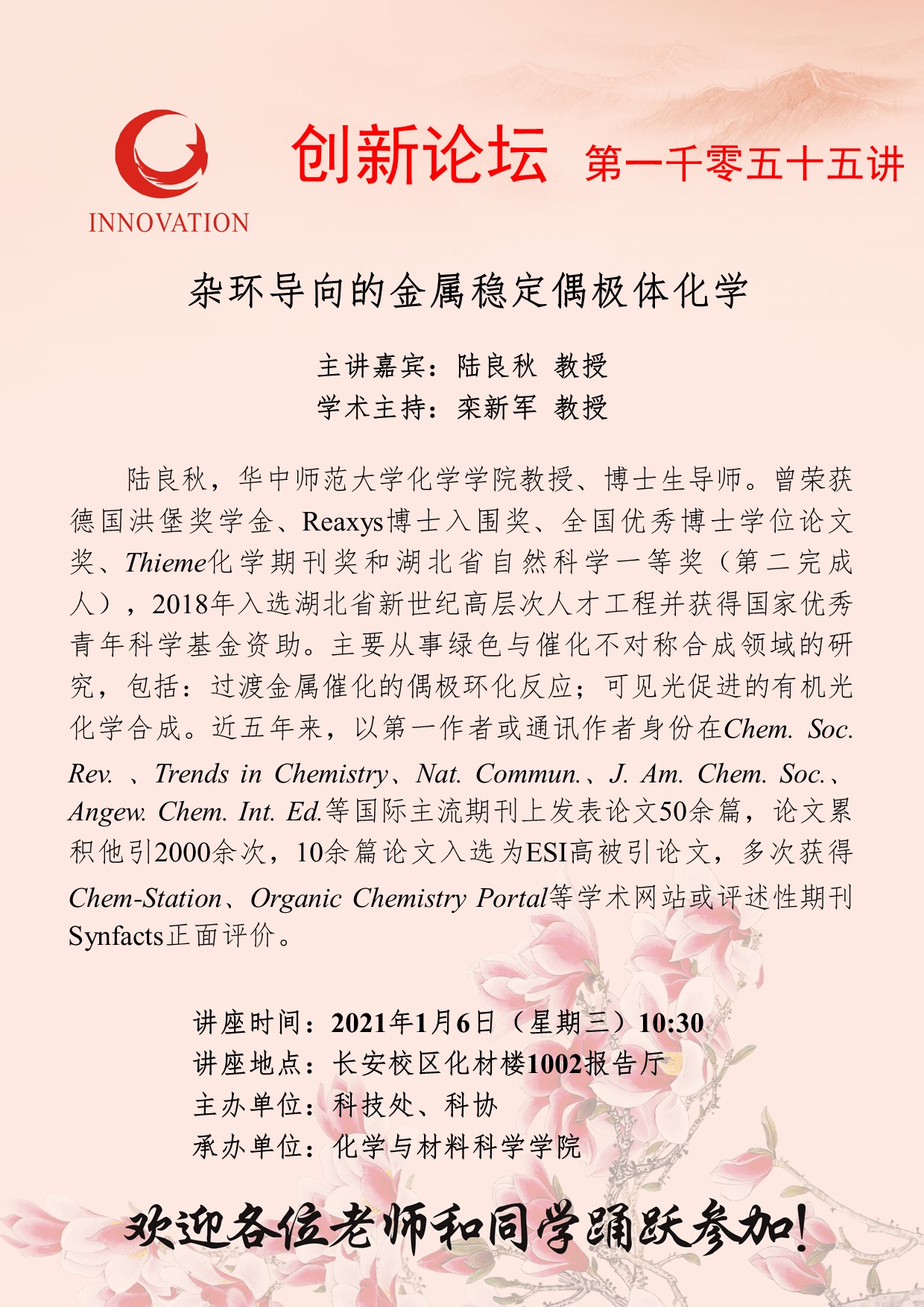 陆良秋 教授 广发体育创新论坛第一千零五十五讲:杂环导向的金属稳定偶极体化学 讲座时间 2021年1月6日(星期三)10:30 讲座地点 长安校区化材楼1002报告厅 讲座人介绍 陆良秋 教授 讲座内容