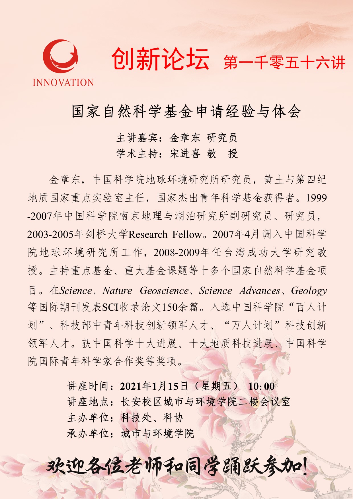 金章东 研究员 广发体育创新论坛第一千零五十六讲:国家自然科学基金申请经验与体会 讲座时间 2021年1月15日(星期五) 10:00 讲座地点 长安校区城市与环境学院二楼会议室 讲座人介绍 金章东 研究员 讲座内容