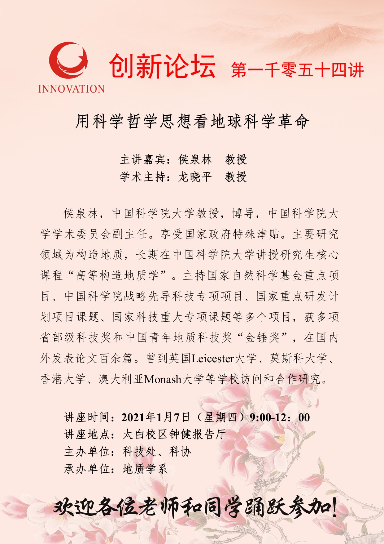 侯泉林 教授 广发体育创新论坛第一千零五十四讲:用科学哲学思想看地球科学革命 讲座时间 2021年1月7日(星期四) 9:00-12:00 讲座地点 太白校区钟健报告厅 讲座人介绍 侯泉林 教授 讲座内容