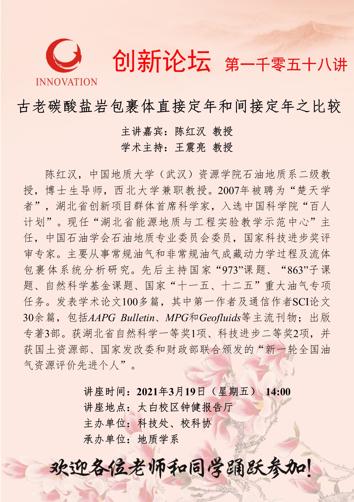 陈红汉 教授 广发体育创新论坛第一千零五十八讲:古老碳酸盐岩包裹体直接定年和间接定年之比较 讲座时间 2021年3月19日(星期五) 14:00 讲座地点 太白校区钟健报告厅 讲座人介绍 陈红汉 教授 讲座内容