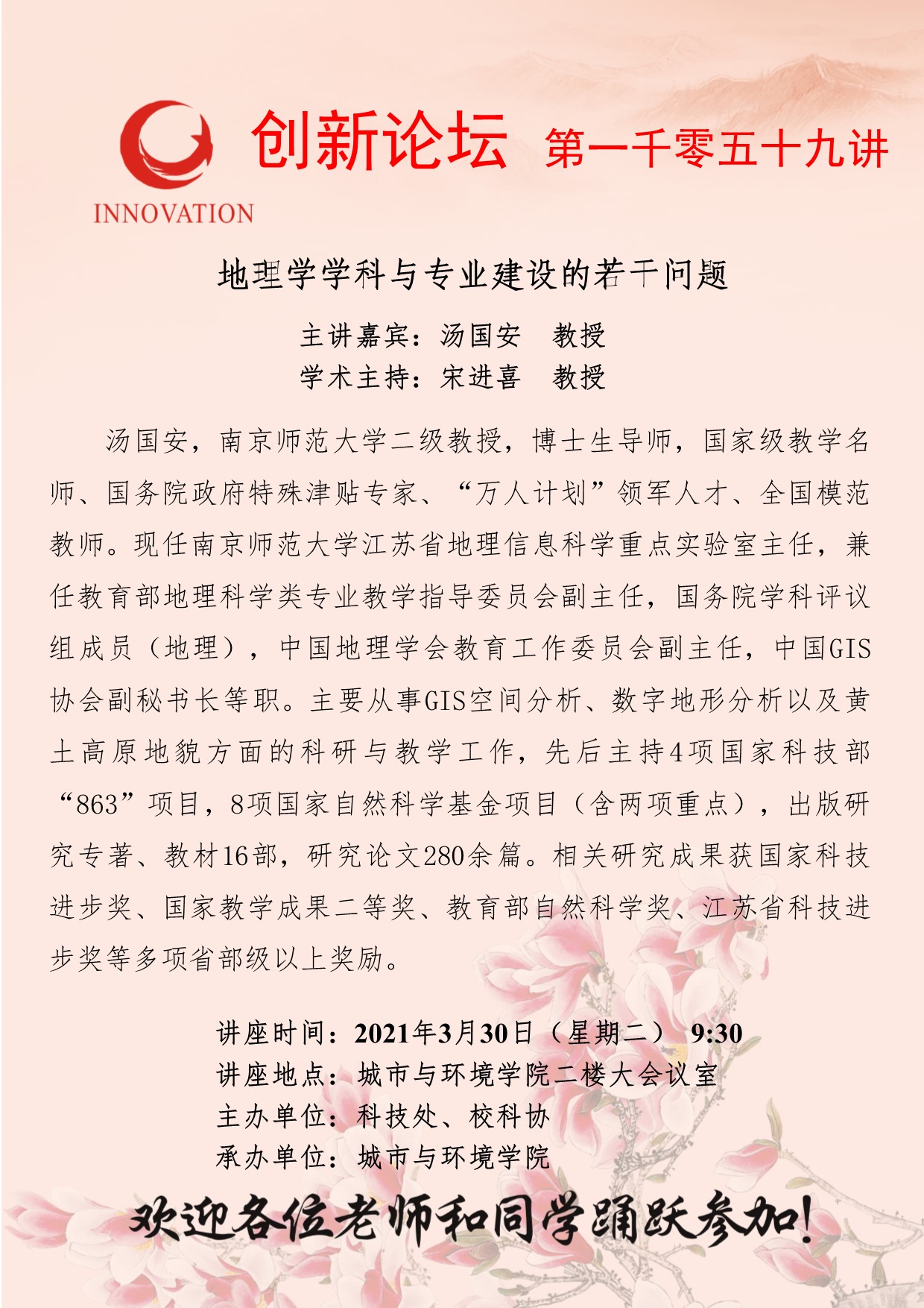 汤国安 教授 广发体育创新论坛第一千零五十九讲:地理学学科与专业建设的若干问题 讲座时间 2021年3月30日(星期二) 9:30 讲座地点 城市与环境学院二楼大会议室 讲座人介绍 汤国安 教授 讲座内容