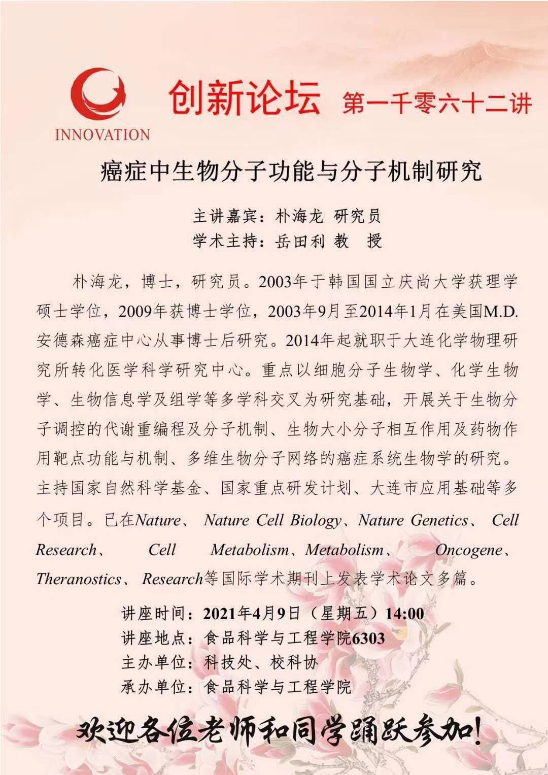 朴海龙 研究员 广发体育创新论坛第一千零六十二讲:癌症中生物分子功能与分子机制研究 讲座时间 2021年4月9日(星期五)14:00 讲座地点 食品科学与工程学院6303 讲座人介绍 朴海龙 研究员 讲座内容