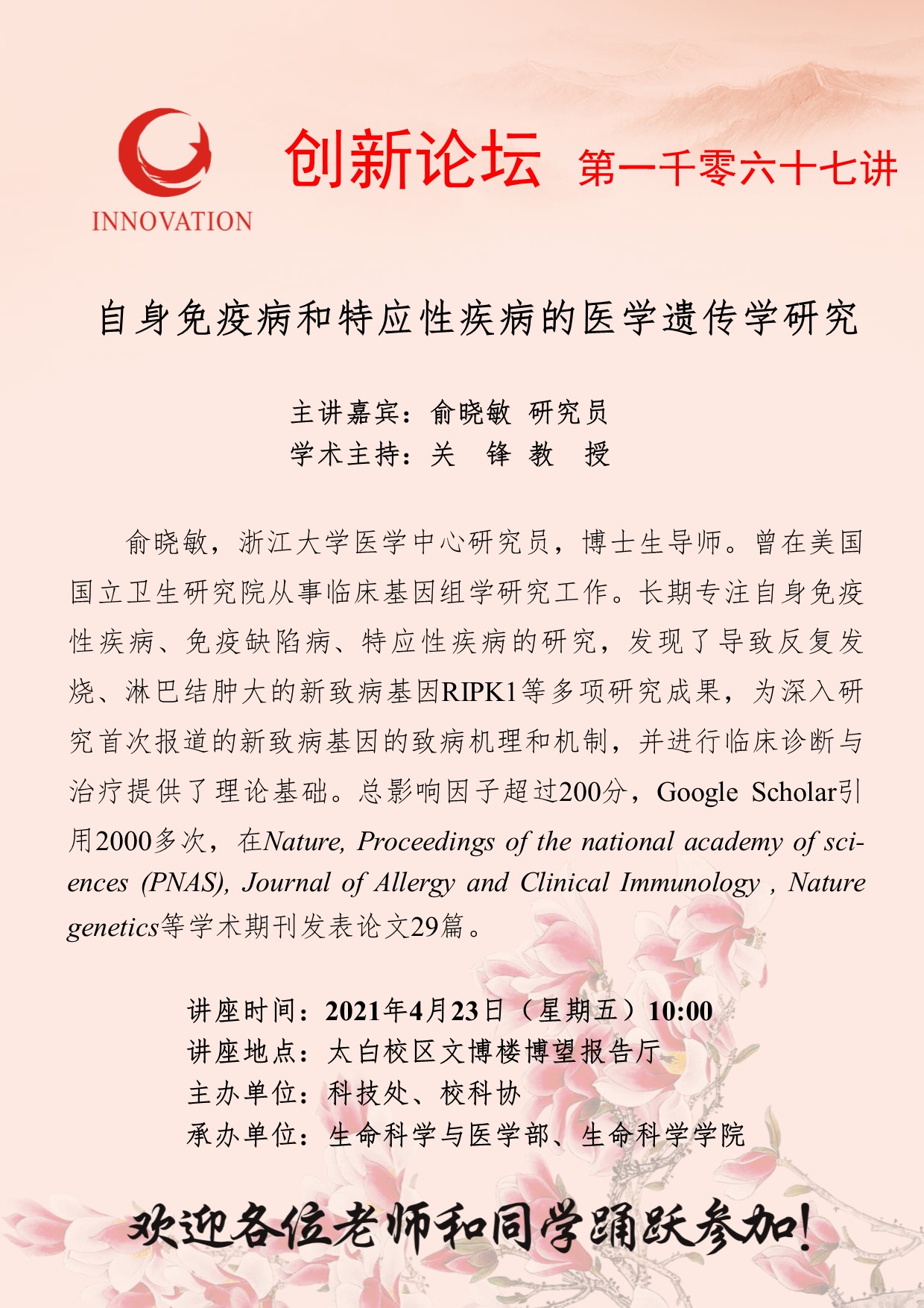 俞晓敏 研究员 广发体育创新论坛第一千零六十七讲:自身免疫病和特应性疾病的医学遗传学研究 讲座时间 2021年4月23日(星期五)10:00 讲座地点 太白校区文博楼博望报告厅 讲座人介绍 俞晓敏 研究员 讲座内容