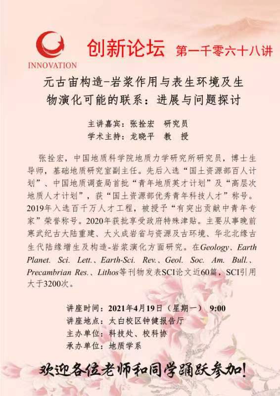 张拴宏 研究员 广发体育创新论坛第一千零六十八讲:元古宙构造-岩浆作用与表生环境及生物演化可能的联系:进展与问题探讨 讲座时间 2021年4月19日(星期一) 9:00 讲座地点 太白校区钟健报告厅 讲座人介绍 张拴宏 研究员 讲座内容