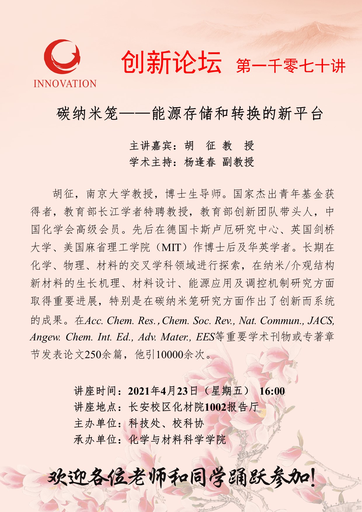 胡征 教授 广发体育创新论坛第一千零七十讲:碳纳米笼——能源存储和转换的新平台 讲座时间 2021年4月23日(星期五) 16:00 讲座地点 长安校区化材院1002报告厅 讲座人介绍 胡征 教授 讲座内容