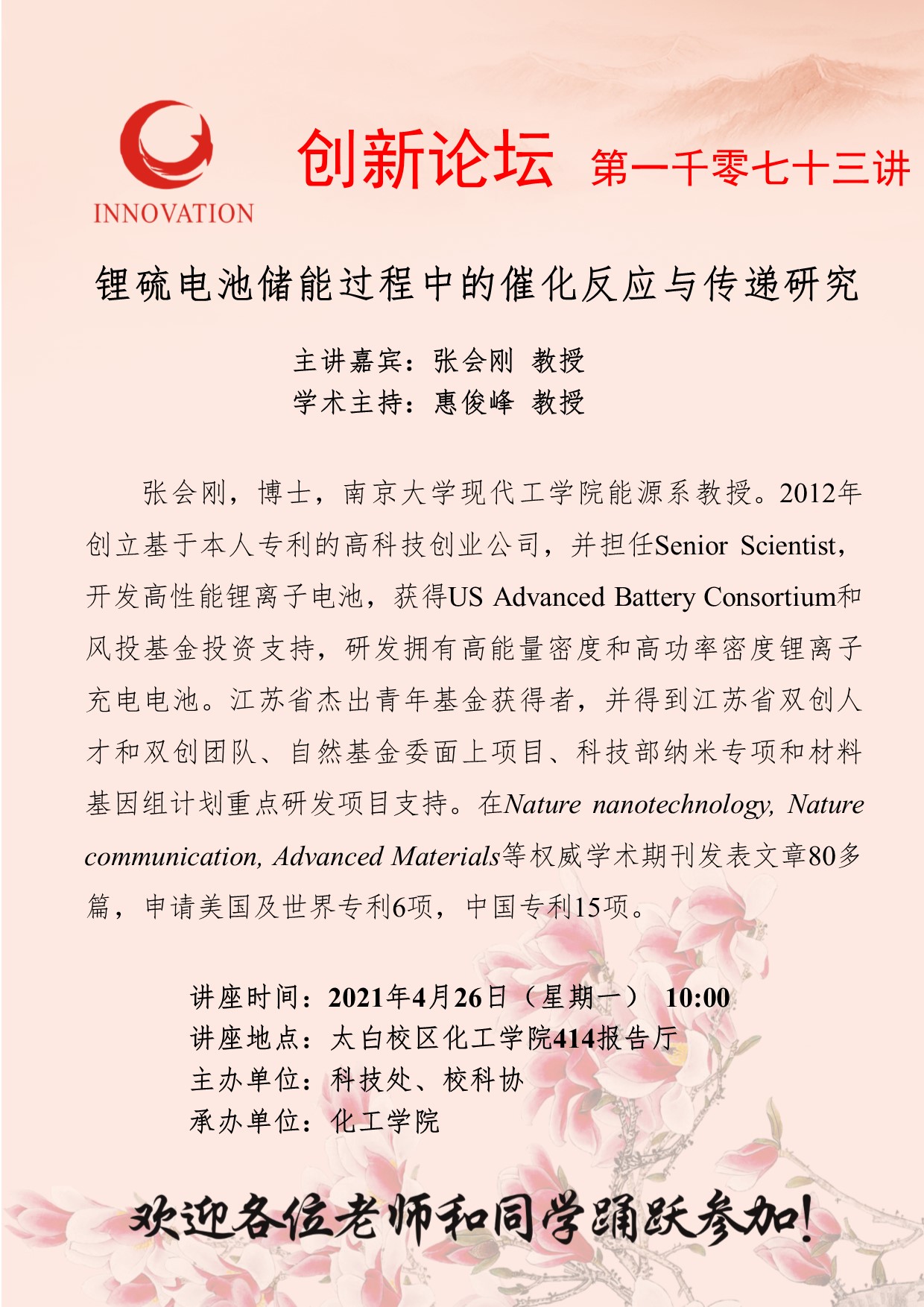 张会刚 教授 广发体育创新论坛第一千零七十三讲:锂硫电池储能过程中的催化反应与传递研究 讲座时间 2021年4月26日(星期一) 10:00 讲座地点 太白校区化工学院414报告厅 讲座人介绍 张会刚 教授 讲座内容