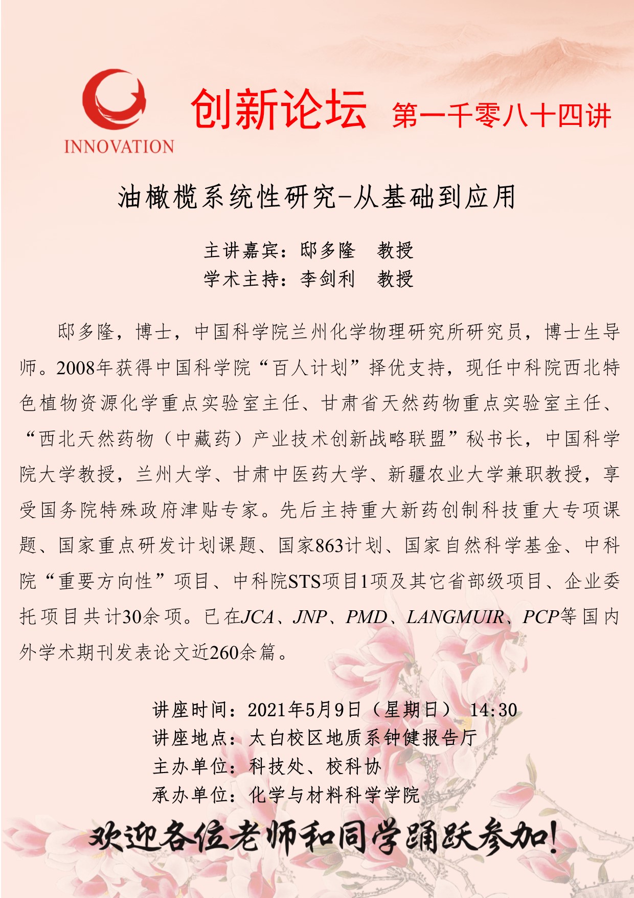 邸多隆 教授 广发体育创新论坛第一千零八十四讲:油橄榄系统性研究-从基础到应用 讲座时间 2021年5月9日(星期日) 14:30 讲座地点 太白校区地质系钟健报告厅 讲座人介绍 邸多隆 教授 讲座内容