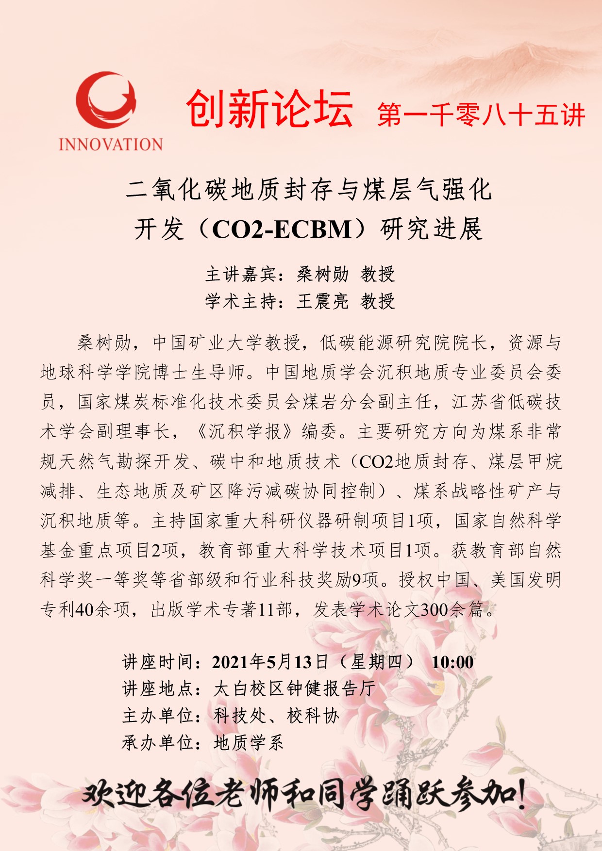 桑树勋 教授 广发体育创新论坛第一千零八十五讲:二氧化碳地质封存与煤层气强化开发(CO2-ECBM)研究进展 讲座时间 2021年5月13日(星期四) 10:00 讲座地点 太白校区钟健报告厅 讲座人介绍 桑树勋 教授 讲座内容