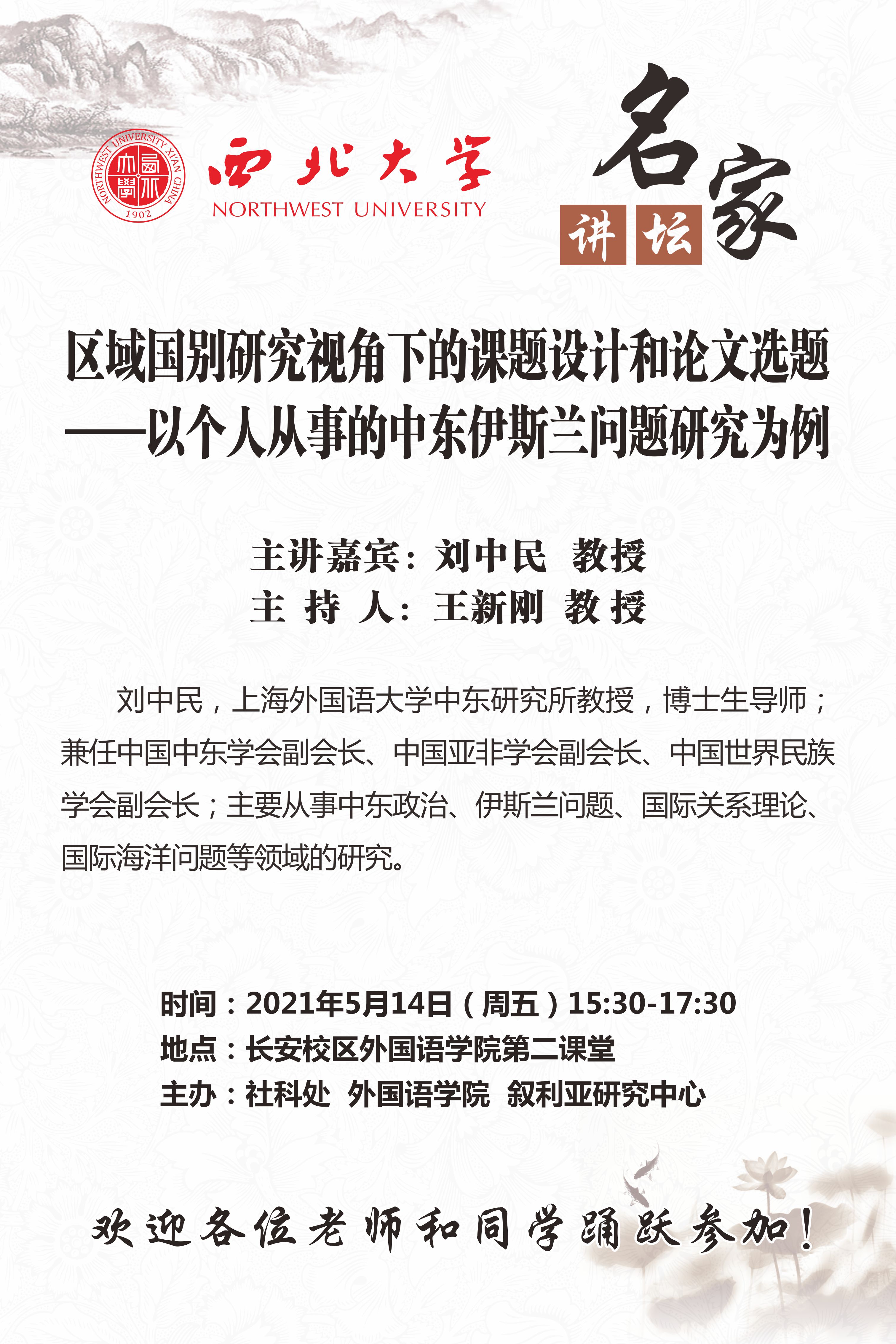 刘中民 教授 名家讲坛:区域国别研究视角下的课题设计和论文选题 讲座时间 2021年5月14日(周五)15:30-17:30 讲座地点 长安校区外国语学院第二课堂报告厅 讲座人介绍 刘中民 教授 讲座内容