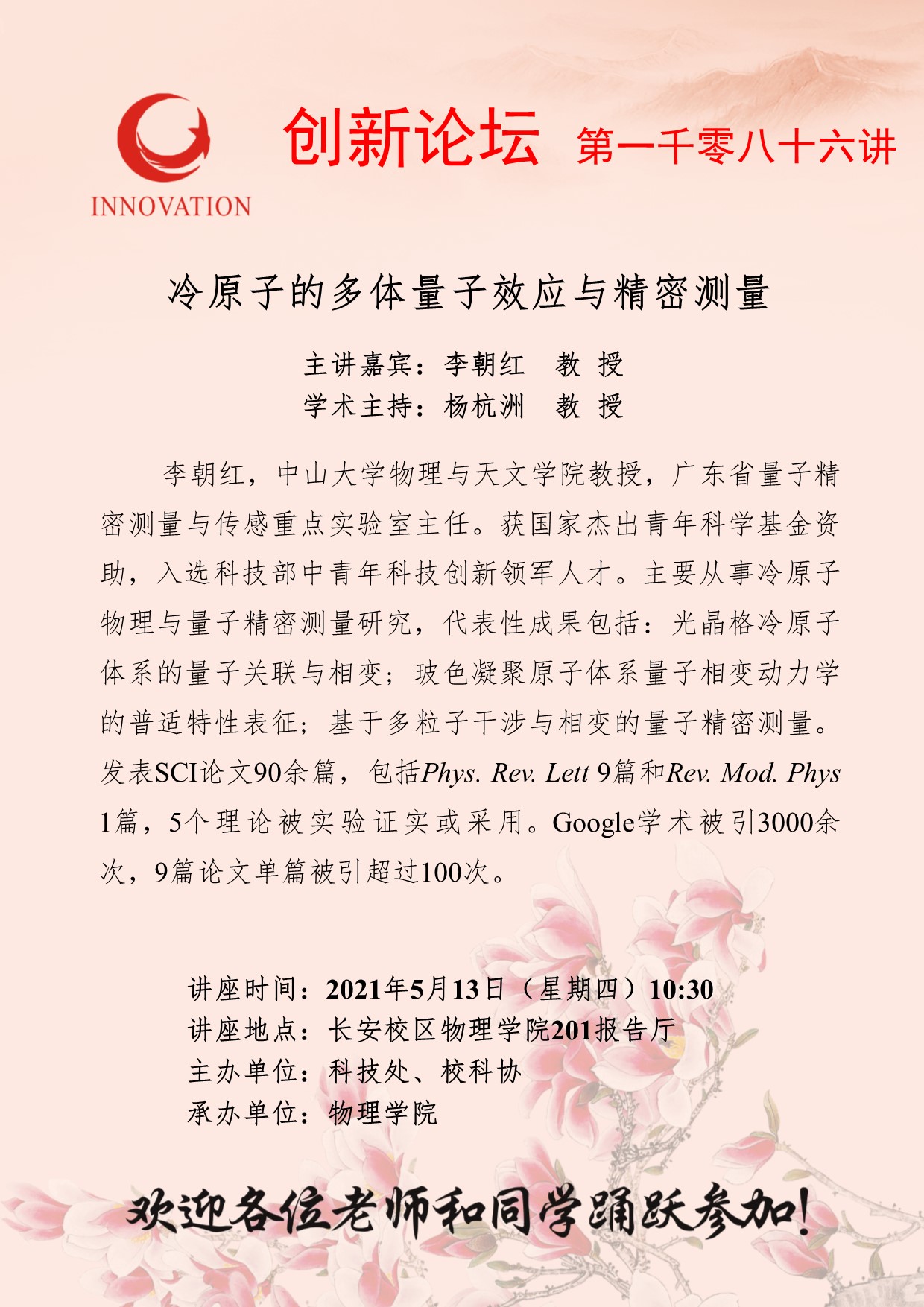李朝红 教 授 广发体育创新论坛第一千零八十六讲:冷原子的多体量子效应与精密测量 讲座时间 2021年5月13日(星期四)10:30 讲座地点 长安校区物理学院201报告厅 讲座人介绍 李朝红 教 授 讲座内容