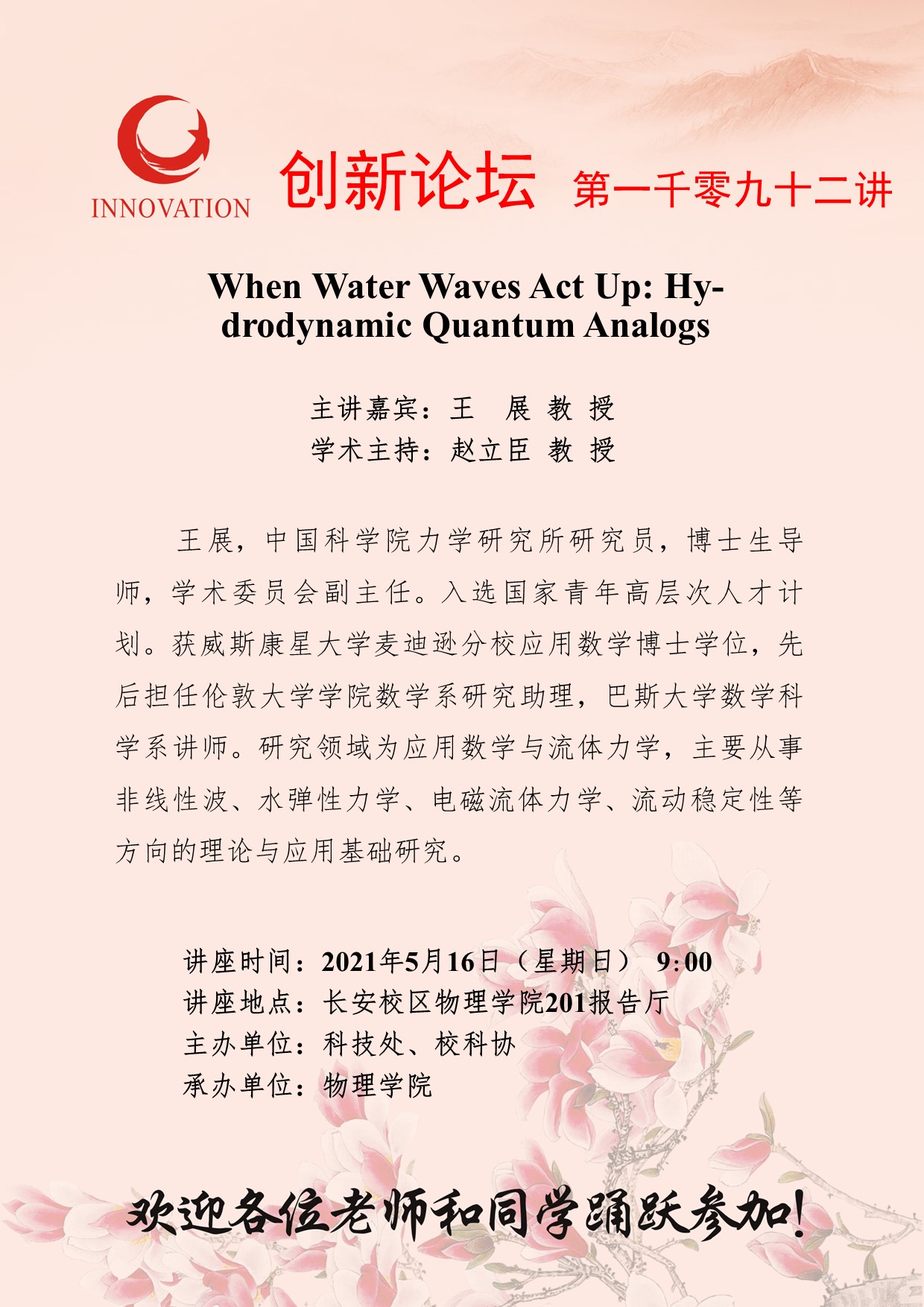王 展 教 授 广发体育创新论坛第一千零九十二讲:When Water Waves Act Up: Hydrodynamic Quantum Analogs 讲座时间 2021年5月16日(星期日) 9:00 讲座地点 长安校区物理学院201报告厅 讲座人介绍 王 展 教 授 讲座内容