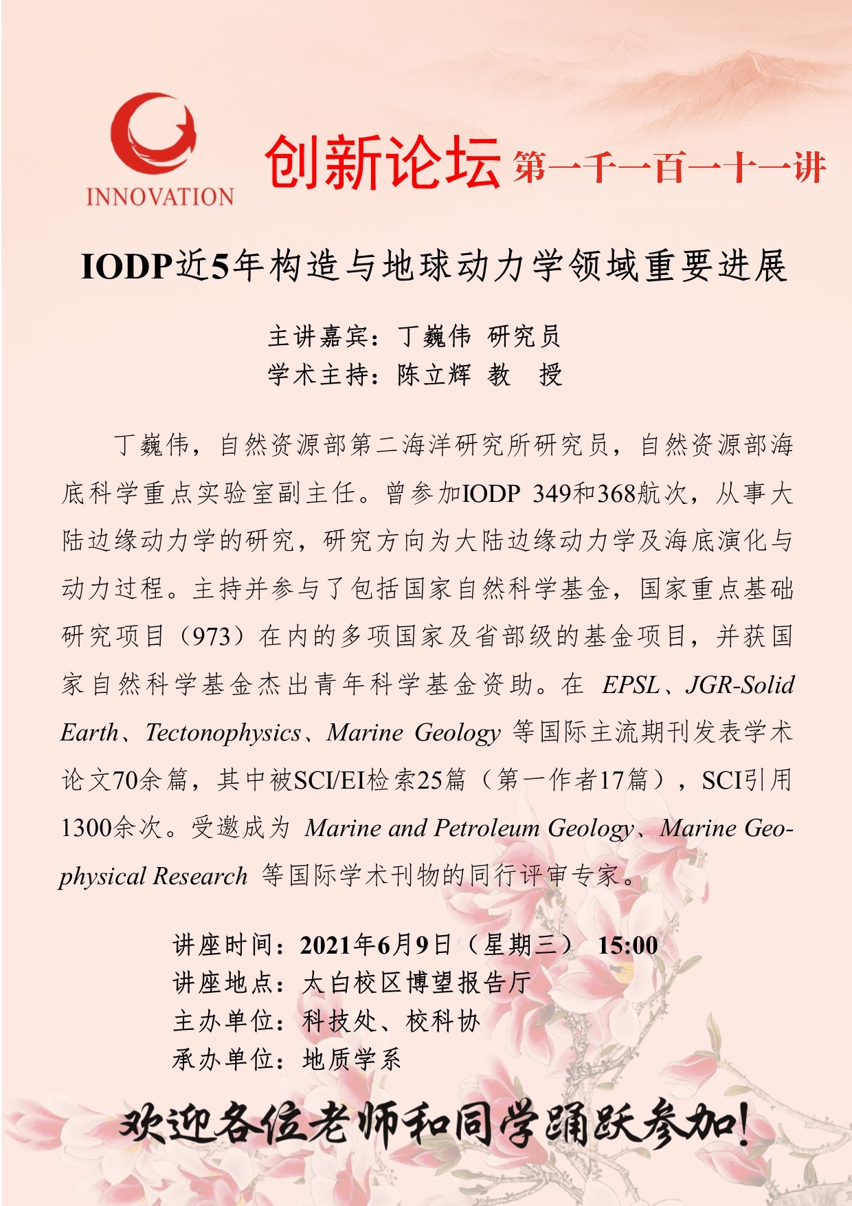 丁巍伟 研究员 广发体育创新论坛第一千一百一十一讲:IODP近5年构造与地球动力学领域重要进展 讲座时间 2021年6月9日(星期三) 15:00 讲座地点 太白校区博望报告厅 讲座人介绍 丁巍伟 研究员 讲座内容