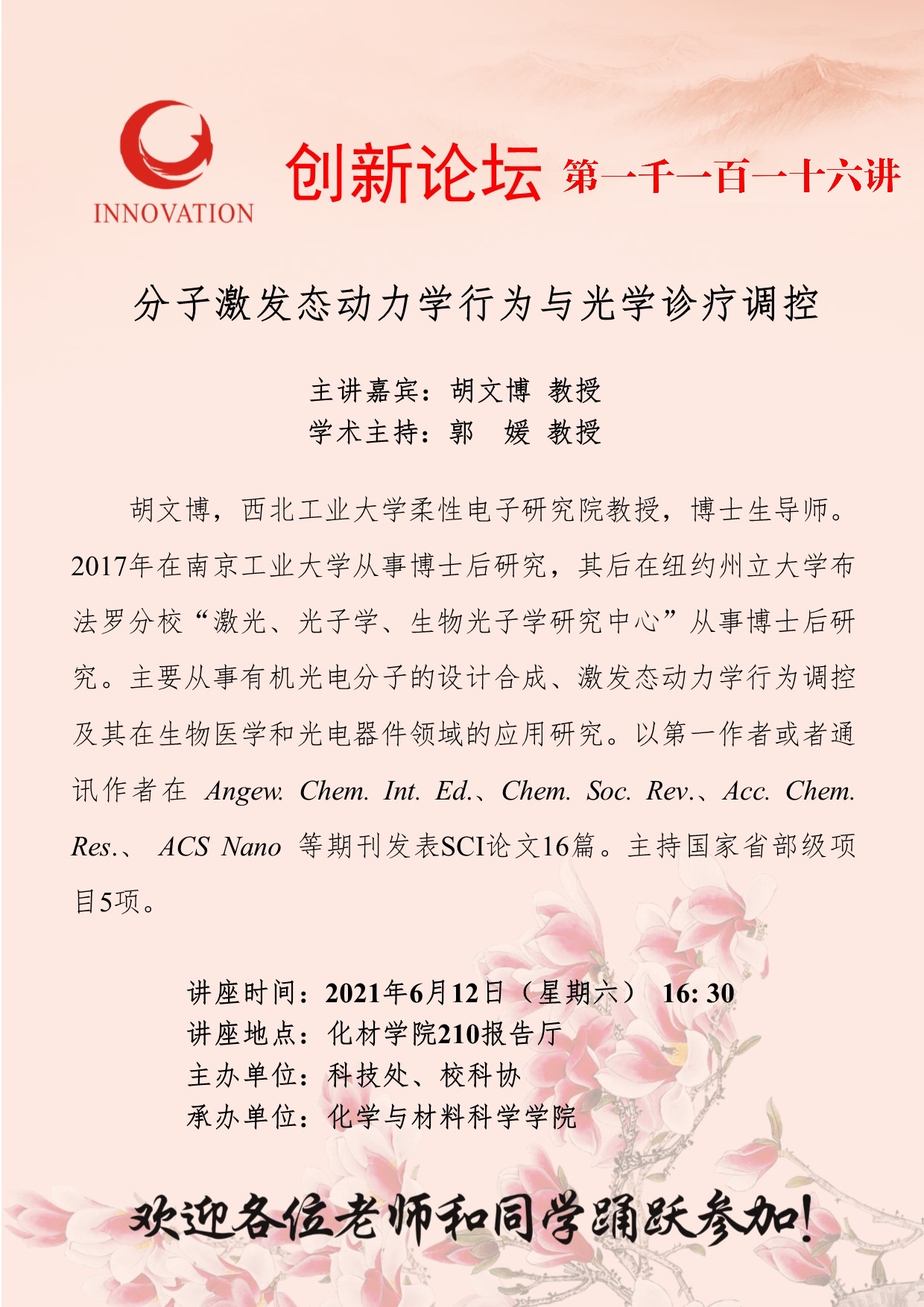 胡文博 教授 广发体育创新论坛第一千一百一十六讲:分子激发态动力学行为与光学诊疗调控 讲座时间 2021年6月12日(星期六) 16:30 讲座地点 化材学院210报告厅 讲座人介绍 胡文博 教授 讲座内容