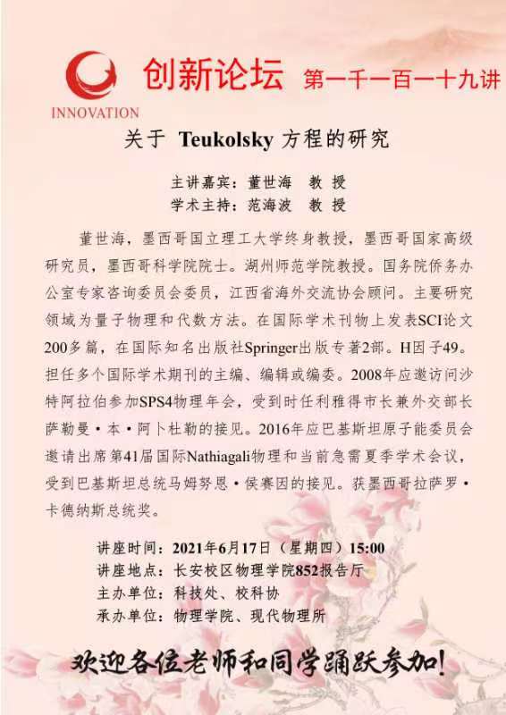 董世海 教 授 广发体育创新论坛第一千一百一十九讲:关于 Teukolsky 方程的研究 讲座时间 2021年6月17日(星期四)15:00 讲座地点 长安校区物理学院852报告厅 讲座人介绍 董世海 教 授 讲座内容