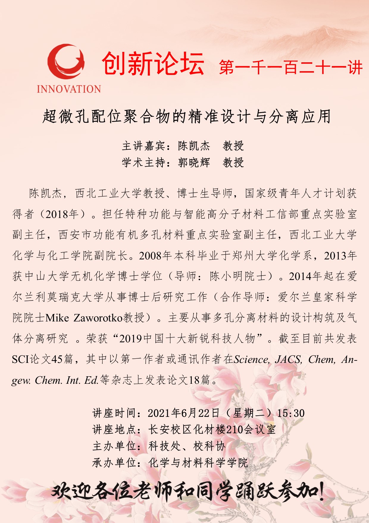 陈凯杰 教授 广发体育创新论坛第一千一百二十一讲:超微孔配位聚合物的精准设计与分离应用 讲座时间 2021年6月22日(星期二)15:30 讲座地点 长安校区化材楼210会议室 讲座人介绍 陈凯杰 教授 讲座内容